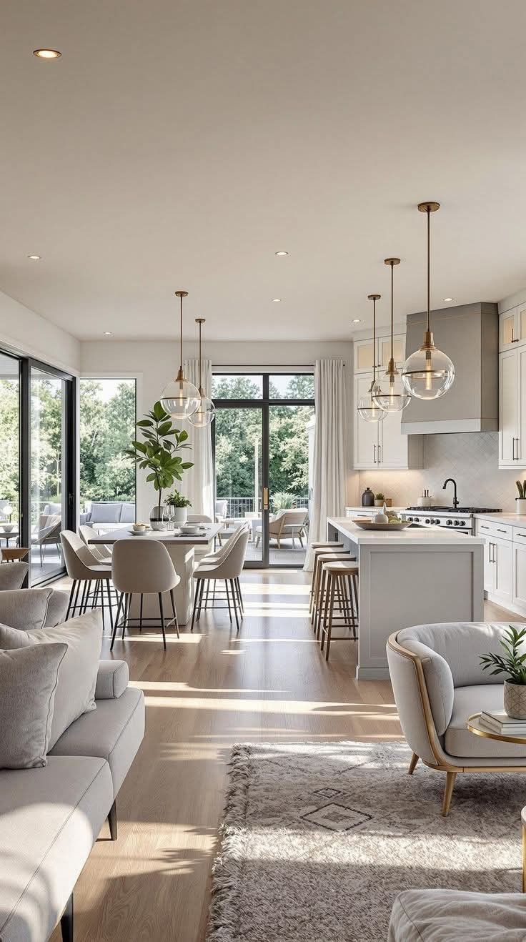transform this image into a modern open concept kitchen and living room design create a cohesive airy layout that blends the two spaces seamlessly use a neutral color palette featuring warm whites soft beige light taupe and natural wood tones with a tasteful pop of color such as muted sage green dusty blue or soft terracotta incorporated through accent pillows artwork or decor design a functional stylish kitchen with a large island quartz or stone countertops minimalist cabinetry sleek hardware and pendant lighting above the island add bar stools for casual seating include subtle texture through backsplash tile and layered materials in the living room area add a comfortable sectional or sofa accent chairs layered throw pillows a textured area rug and a modern coffee table incorporate greenery throughout potted plants a tall floor plant and smaller decorative plants on shelves or the island if possible add a modern fireplace as a focal point in the living room either built in with a clean surround or a contemporary linear fireplace with simple millwork or stone detail ensure the space feels warm inviting bright and cohesive with natural light flowing throughout style with curated decor such as vases books trays and wall art to create a polished yet livable interior design look
