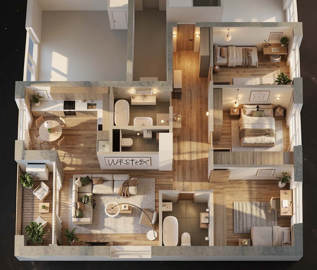 the uploaded image is a finished sketchup interior scene with final materials already applied preserve the camera angle room layout and furniture placement exactly as shown all materials must remain unchanged including the fabric the upholstery the rug the fireplace surround the mantel and the wood flooring do not reinterpret fabrics colors or textures enhance the image by adding realistic lighting shadows and material depth only to create a photorealistic architectural rendering strict preservation keep all fabrics patterns colors and materials exactly as shown material fidelity required warm glowy light and natural light coming in from windows and doors