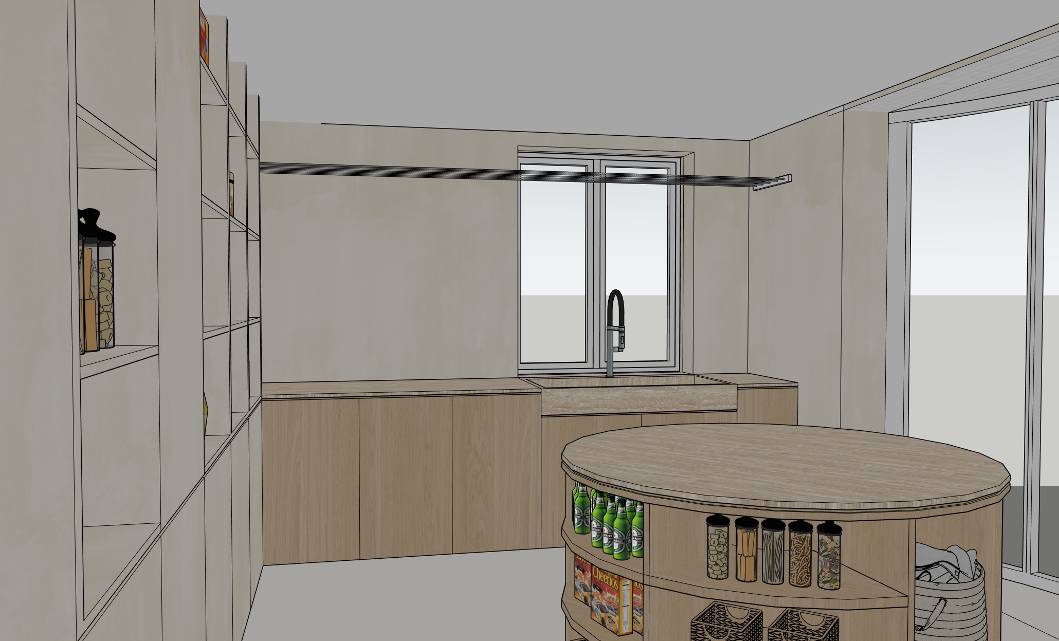 highly realistic interior rendering of an entrance hall with a built in seating bench the left side cabinet wall is fully painted in the same light limewash finish as the walls creating a seamless and calm appearance the remaining cabinets are finished in light oak wood topped with a travertine countertop with a natural subtle texture the window frames are white allowing soft natural daylight to enter the walls are finished in a light limewash and the floor consists of large format lightgray tiles preserve the original proportions materials and overall spatial composition minimal refined atmosphere high realism