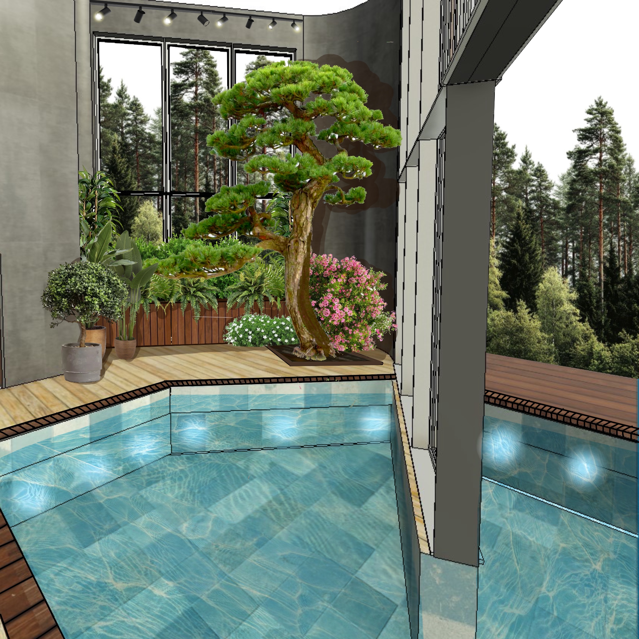 add pool loungers outside next to the pool make it look real create calm warm atmosphere adding steam bubbles and people and sunset