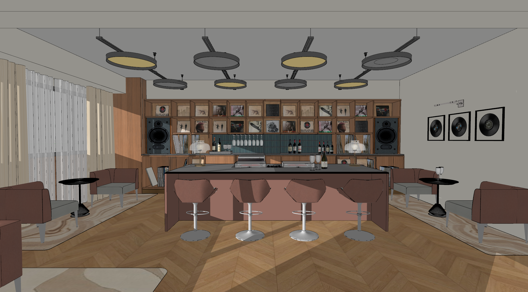 render a stylish modern bar interior with a warm and inviting atmosphere the bar stools are a rich brown leather while the bar countertop is a sleek dark grey marble tile the floor features a light natural wood herringbone pattern adding a touch of elegance the walls are a soft warm beige complemented by large beige curtains that allow natural light to filter through the back wall houses wooden shelves filled with vinyl records and two prominent black speakers creating a retro vibe the lighting is provided by modern circular ceiling lights casting a soft ambient glow with a temperature of 4000k same circular ceiling light with sliver stainless steel surface alternately with the ceiling light the side tables are glossy grey paired with matching brown leather armchairs decorate with wine bottles and art pieces for a cozy sophisticated look