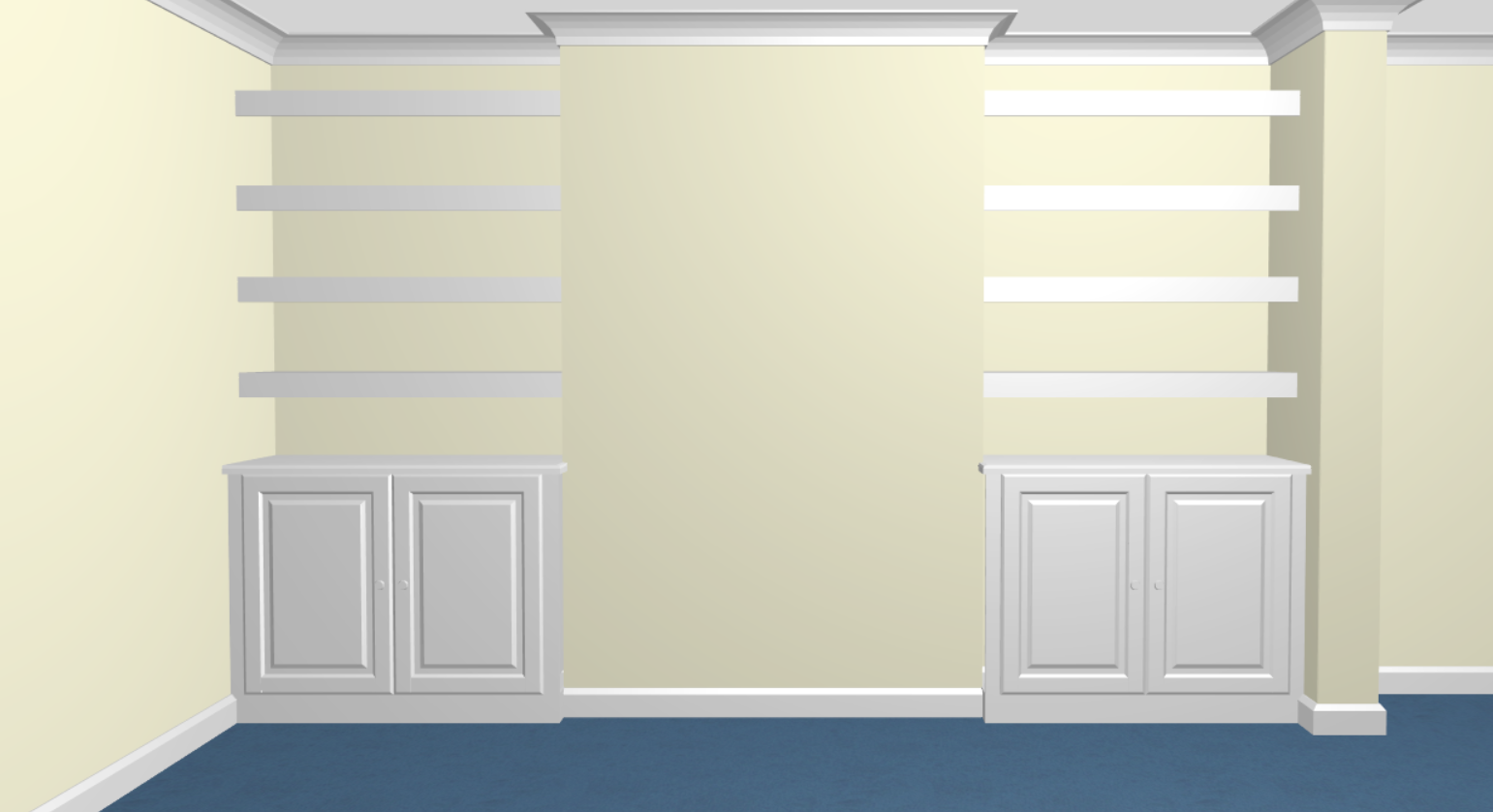 render this as realistic as you can do not chnage the design the picutre shows cupbaords in alcoves either side of a chimney breast make the walls sage green make the carpet beige