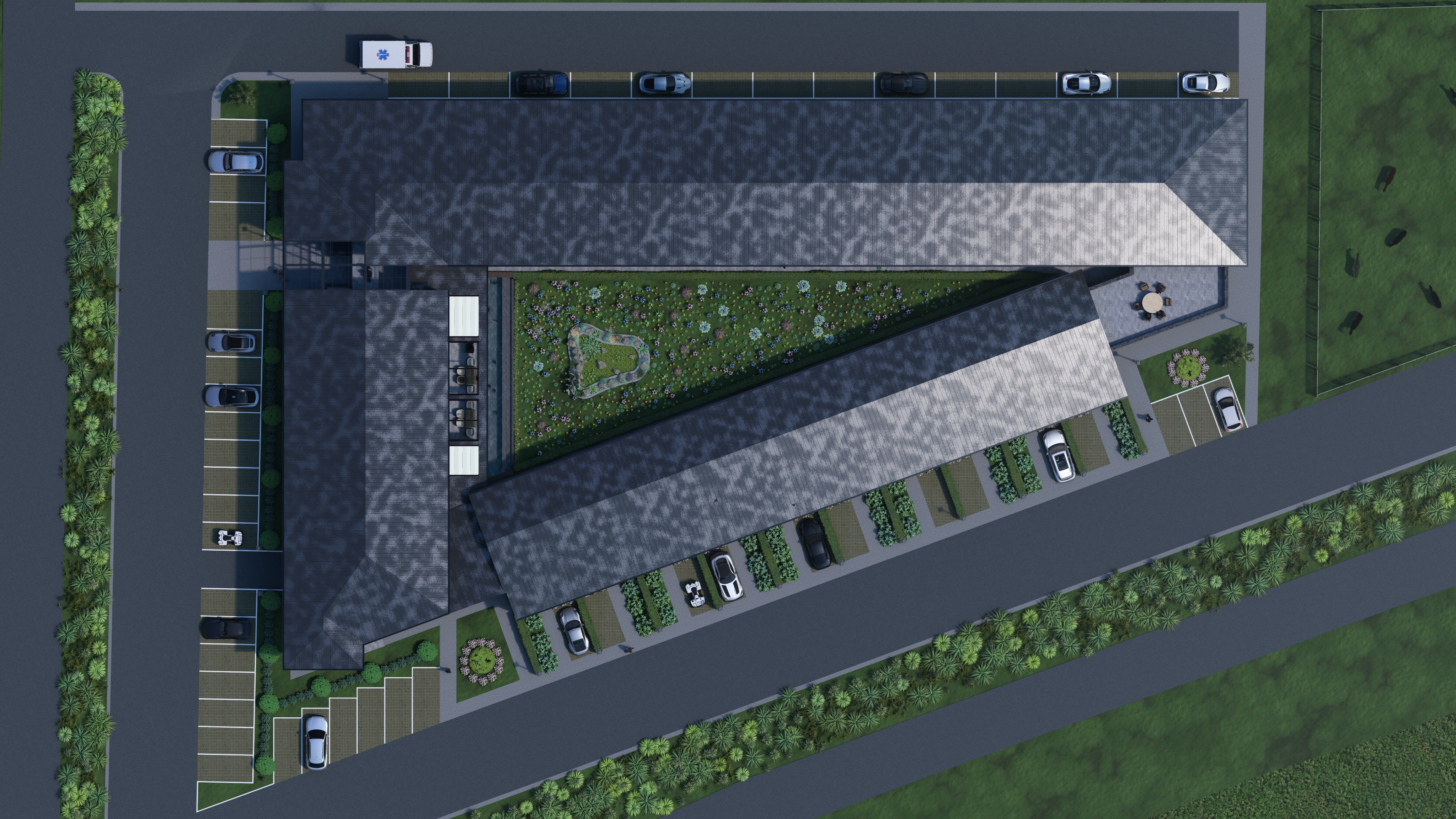 ultra realistic aerial architectural rendering premium residential complex top down drone view soft natural lighting warm sunlight with subtle shadows high end landscaping details refined materials realistic textures vibrant but natural greenery people walking and interacting cars with realistic reflections slightly cinematic atmosphere soft contrast depth and ambient occlusion architectural visualization luxury real estate presentation clean and elegant composition 8k detail