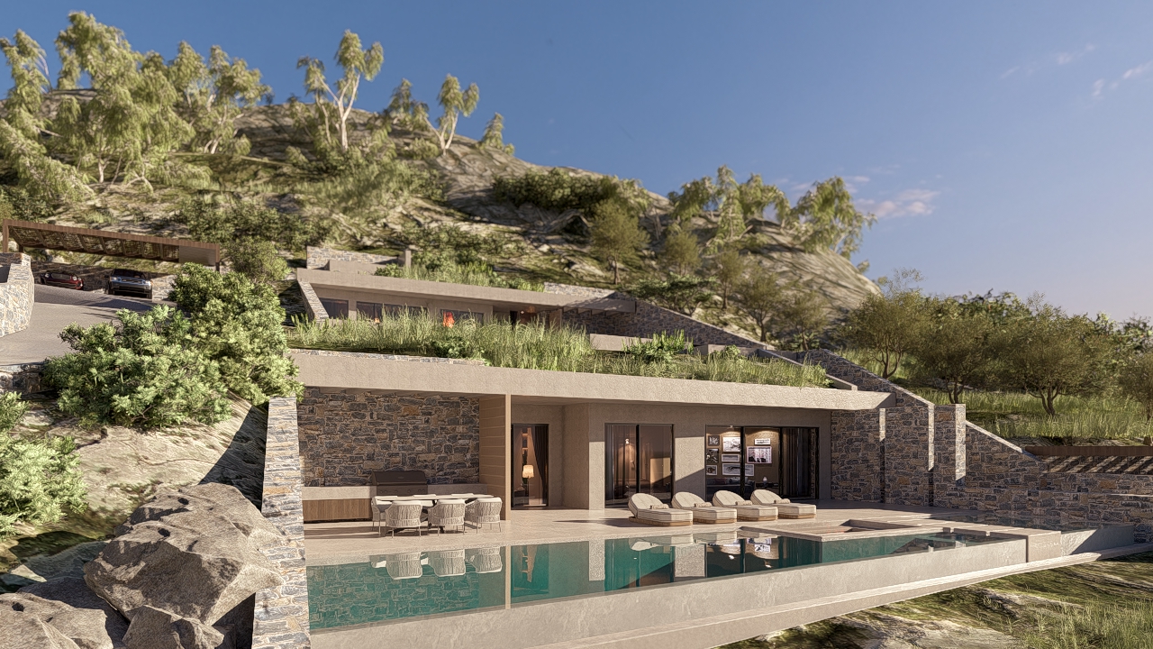 hyper realistic render of houses golden hour lights in the pool ambient lights