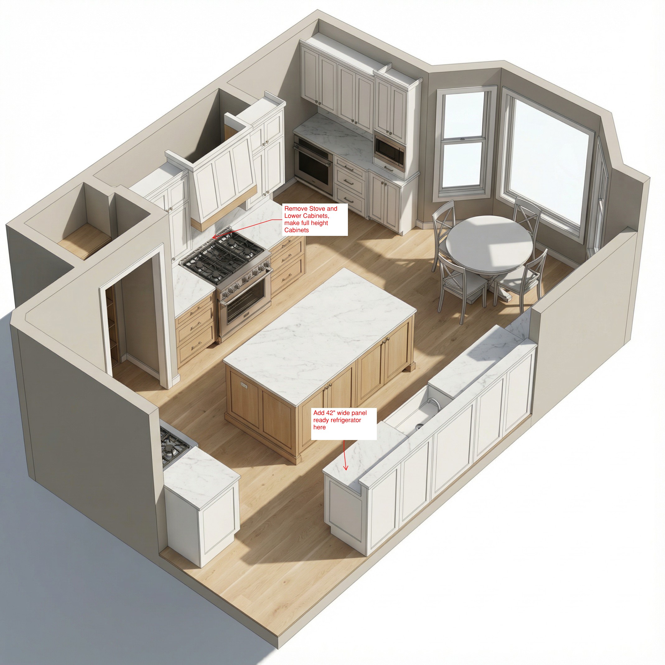 convert this floor plan into a realistic isometric 3d view of a kitchen show the space from an elevated angle with furniture walls and details visible flooring is white oak 7 wide planks lower cabinets at range stove insert are light white oak cabinets at center island is light white oak all other cabinets are painted white countertop is white carrera marble sink is 30 white farm house layout should match floor plan use the same furniture as shows on the plan do not change the orientation of the floorplan