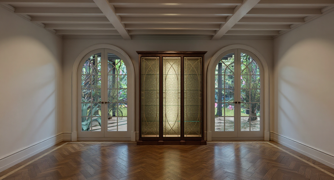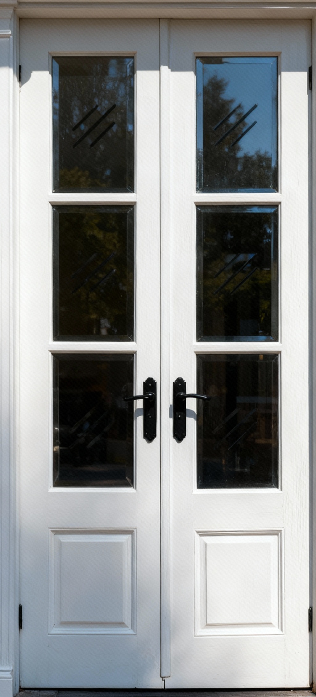 two 2 enameled white interior french doors with clear reflective glass and black hardware