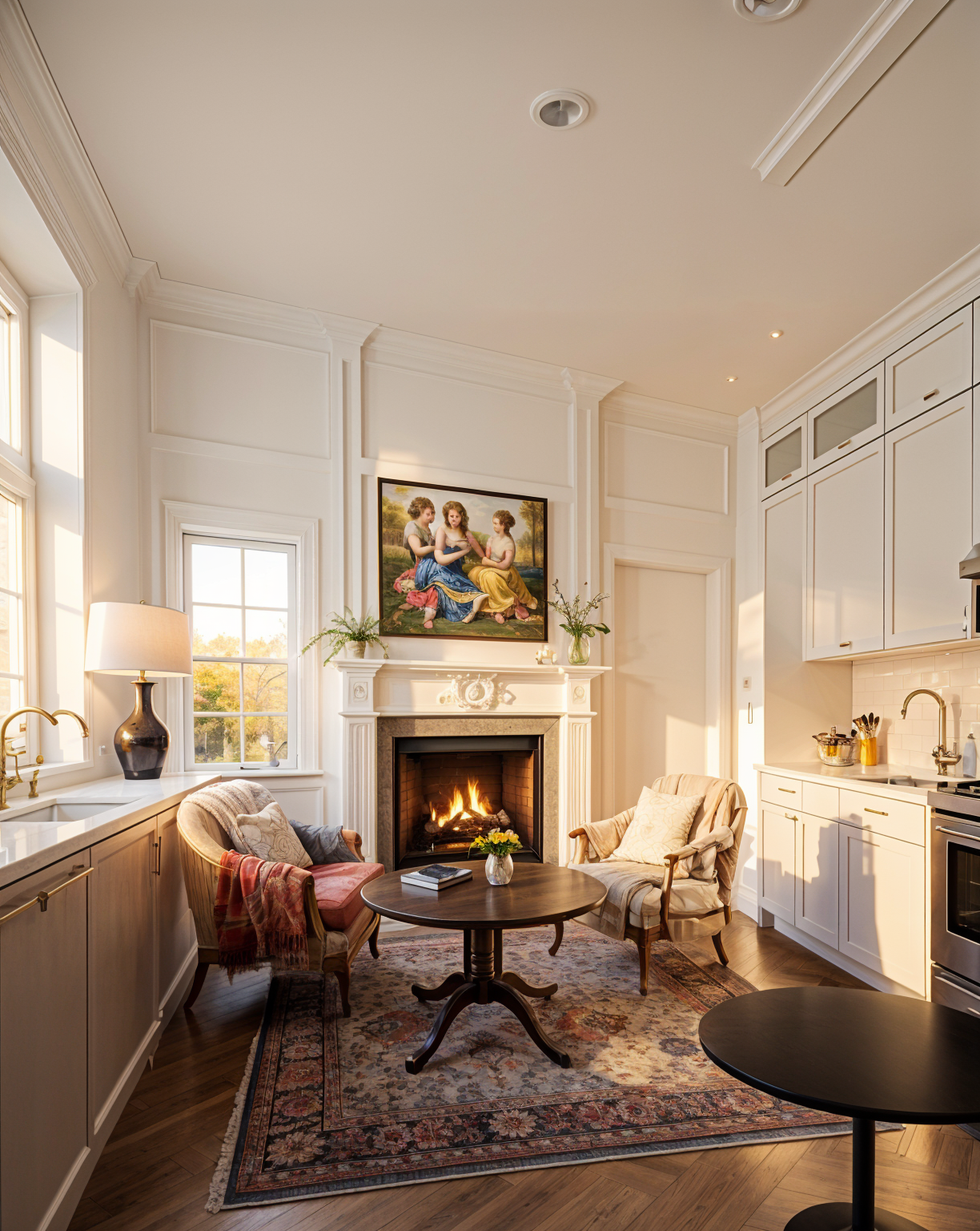you are a professional rendering service offering the highest quality renderings in the world render this living room with furnishings curtains on the windows a tv above the mantle and a fire in the fireplace keep all windows as they are where they are