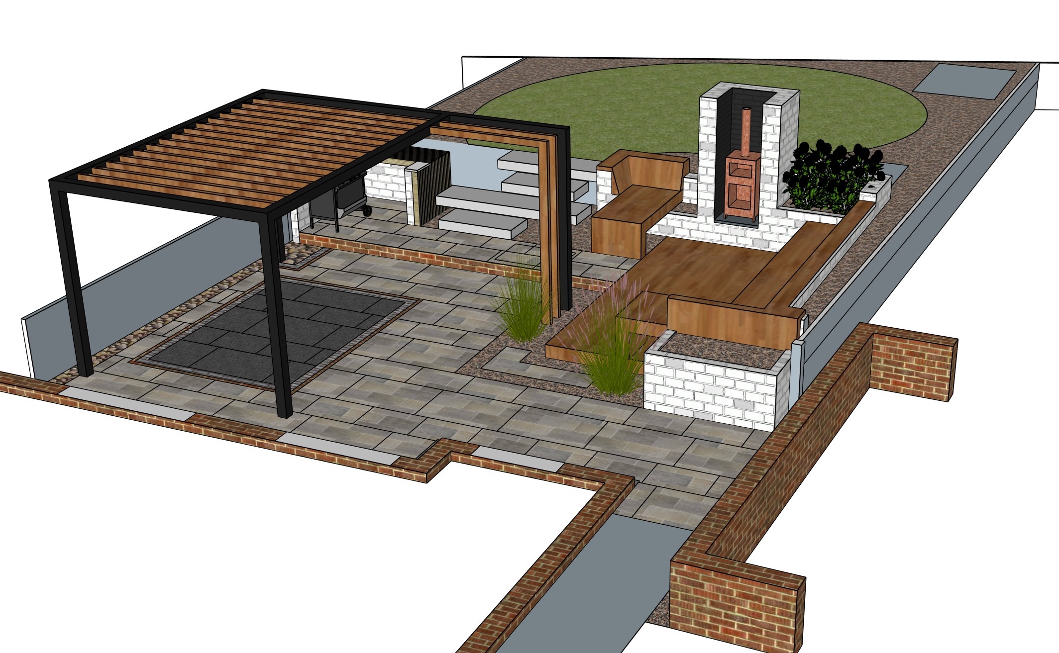 make this garden design model photorealistic the weather should be sunny white areas around the edge should be left white populate the brown area to the rear of the model around the circular green lawn with shrub planting