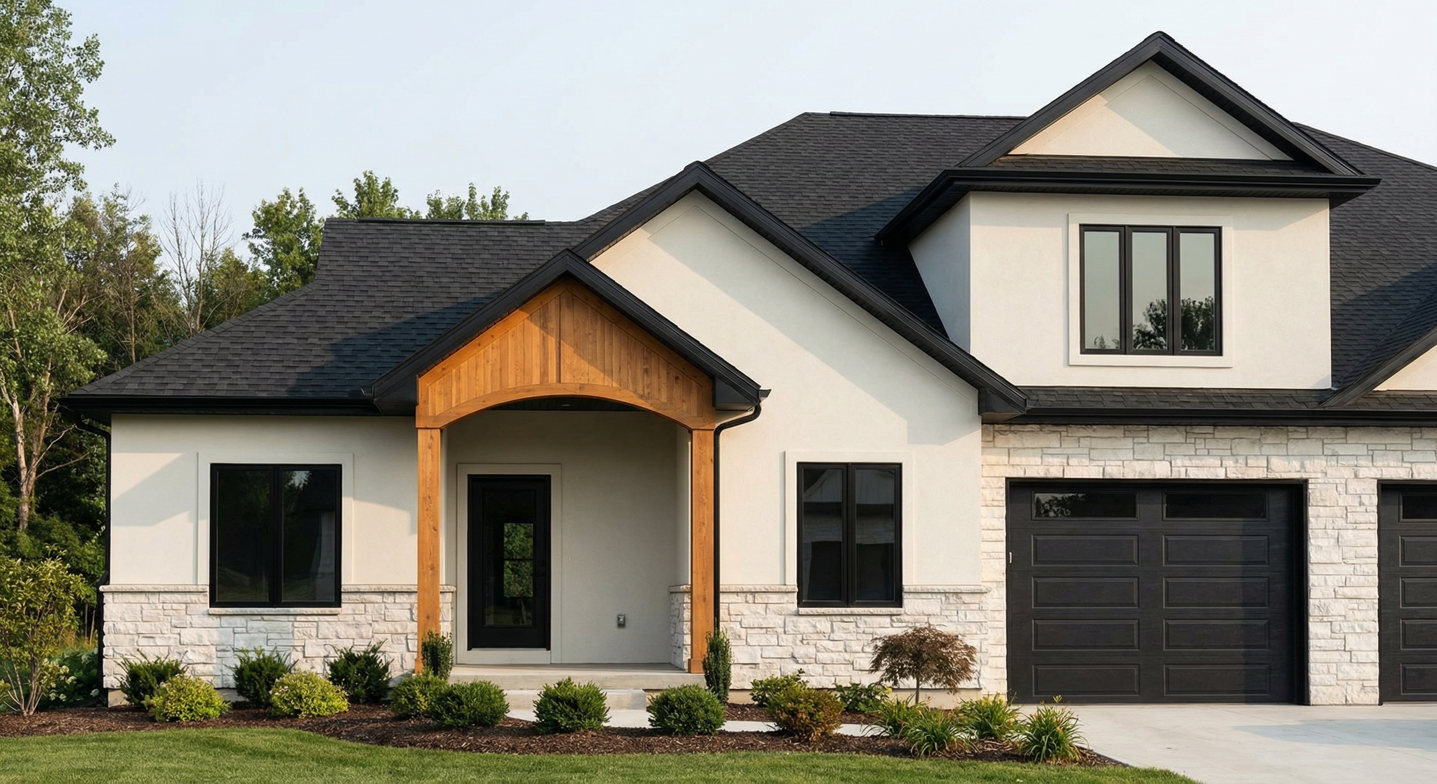 make this image more photo realistic keep the view the same show a landscape with tall grasses and a japanese maple out the large window on the left hand side of theon dark wall