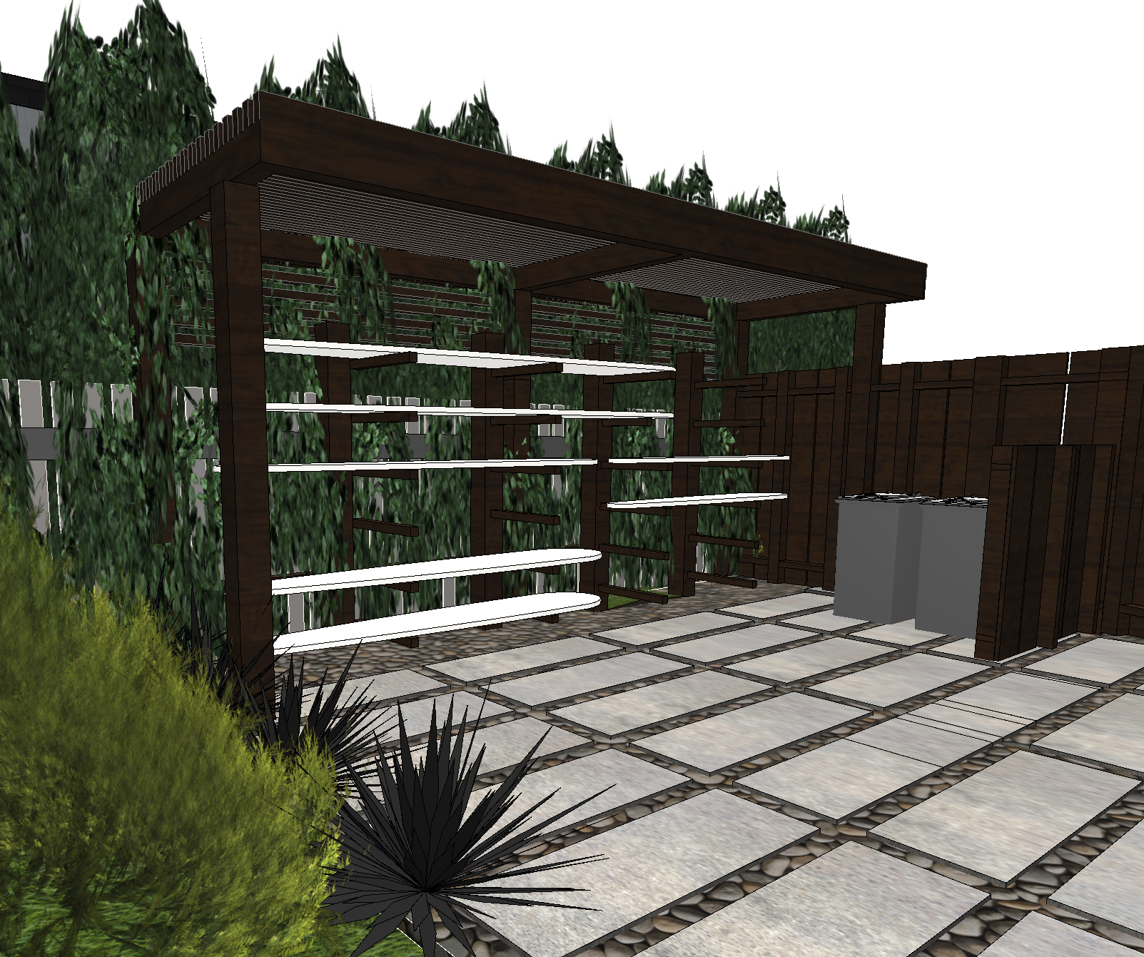 redwood trellis with surfboard racks redwood fence morning sun blue stone pavers on top of cobble stone and dymondia in between in the divisions amongst the stones