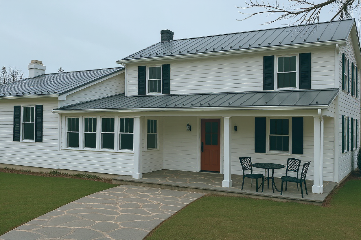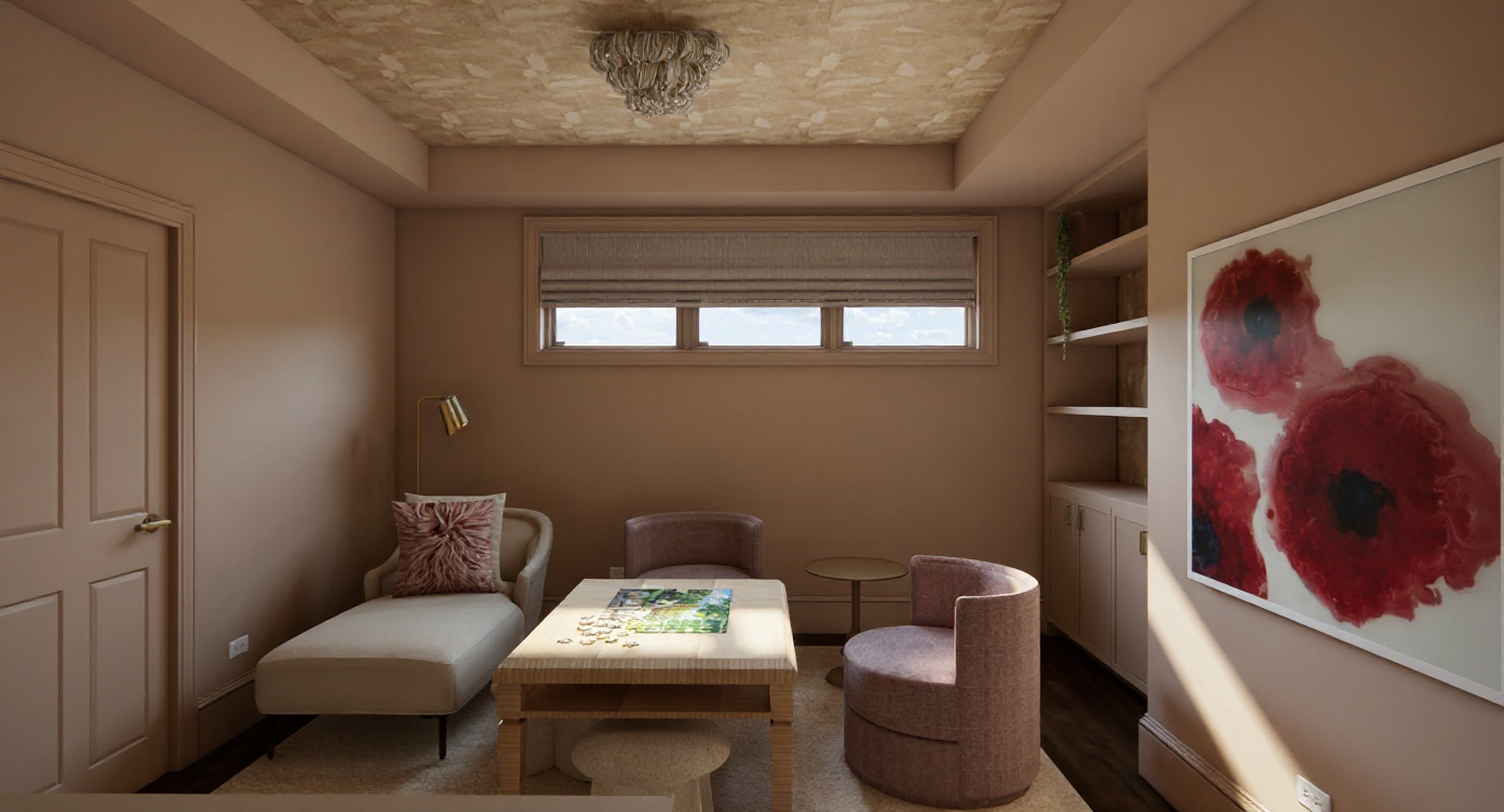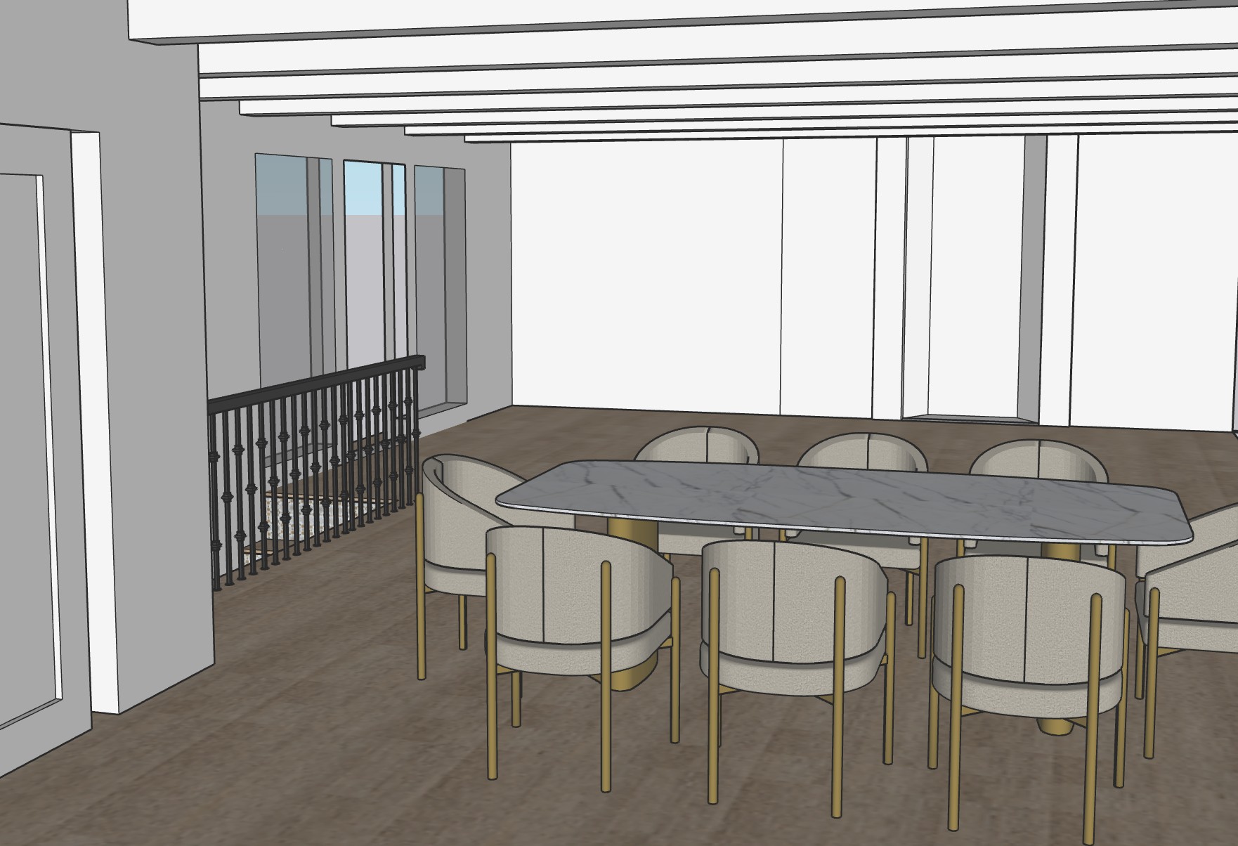 make railing more sleek turn table to wood that matches the color of the floor and add a wood border to the windows that matches floor