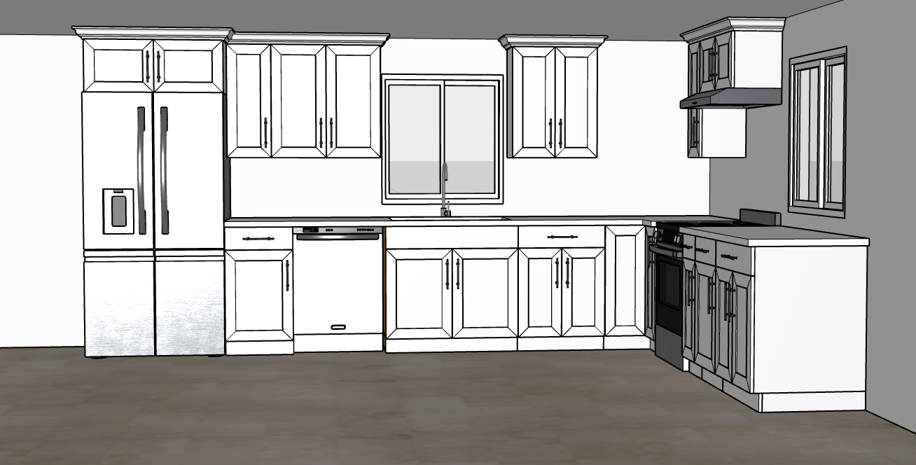 this is a beautiful basement kitchen with nice white cabinets the counter tops are a nice modern granite and the floors are an off white tile with dark grout there is tons of natural light coming in through the two windows the cabinets go all the way to the ceiling with a nice crown molding cabinet handles are matt black there is no upper cabinets in the corner the crown molding is single step 3in crown