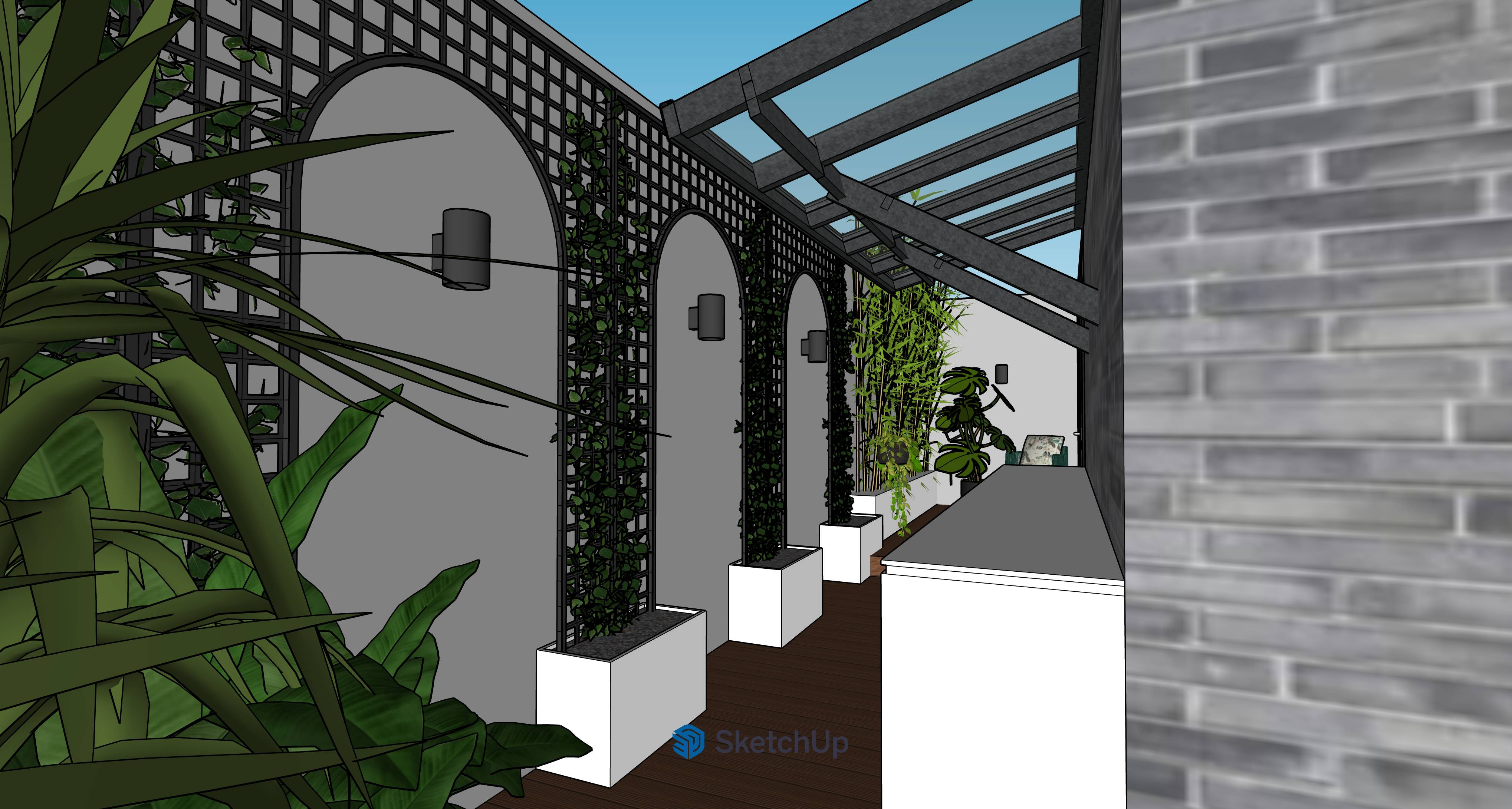 photo realistic render of a modern outdoor corridor at twilight with a sleek and elegant atmosphere the walls on the left are a gray venetian plaster a accented by black victorian arches fretwork with green ivy the floor is rich dark brown wood adding warmth to the scene the brick wall on the right is textured in muted gray tones of a warehouse facade providing a contemporary feel light fixtures are matte black with up lighting and down lighting effect the roof structure consists of black steel beams with clear glass panes lush green tropical plants in black planters line the corridor adding vibrant touches of nature a clear blue sky is visible through the open roofing casting natural light that enhances the inviting and serene atmosphere on the right is a low cabinet with a pantry sink