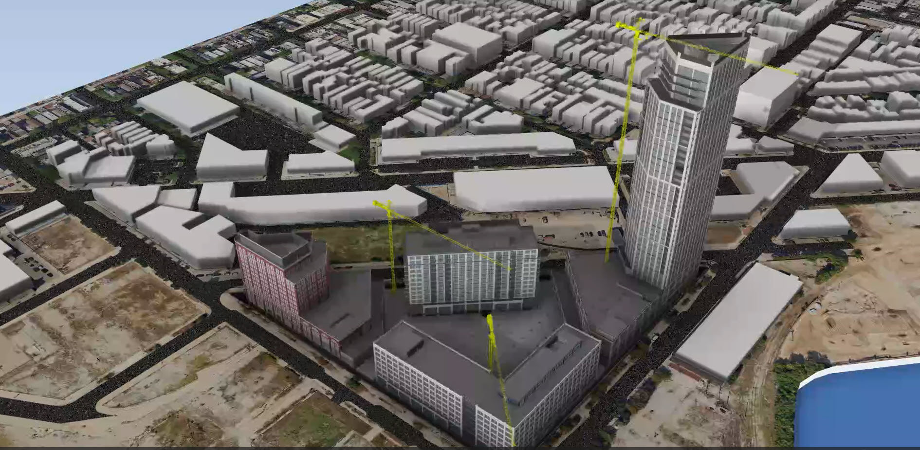 turn into realistic rendering of aerial view of buildings in a chicago landscape