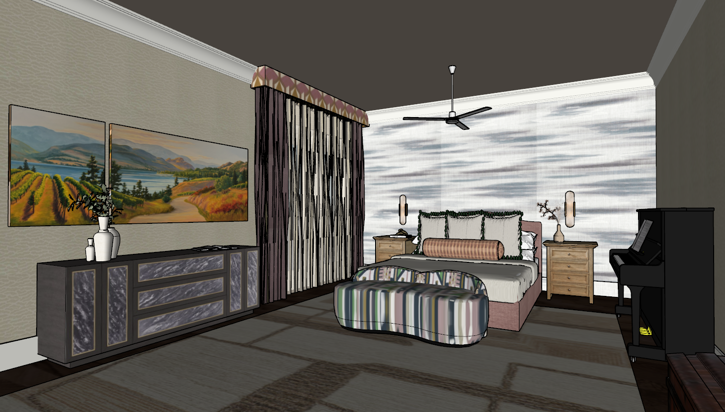 please redo the wall behind the bed is wallpaper put the art in a canvas leave the original wallpapers