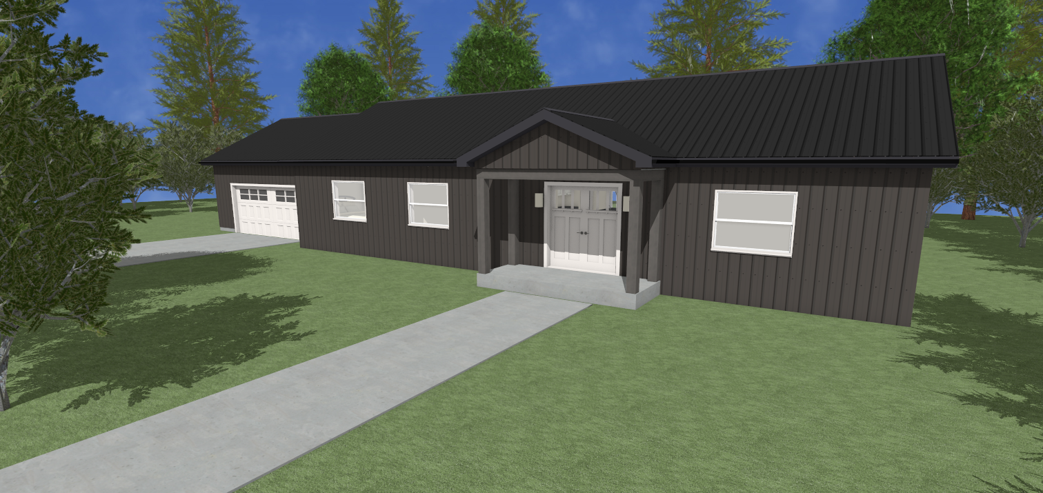 ultra high resolution photorealistic rendering of a modern single story house with abm panel siding featuring exposed fasteners in dark charcoal color and a black metal roof the house has a centered gable porch supported by two posts white double front doors and white awning windows with accurate spacing and alignment an attached garage with matching white doors is on the left side retain all dimensions proportions and architectural details exactly as shown the exterior materials should have realistic textures metal reflections and natural lighting surround the structure with a lush green forest background featuring tall trees and sunlight streaming through the branches creating dappled shadows across the fa ade and lawn add a concrete pathwalk extending from the front entry and wrapping around the house integrated naturally into the grassy terrain the overall atmosphere should feel bright warm and inviting with fine detail depth and true to life rendering quality