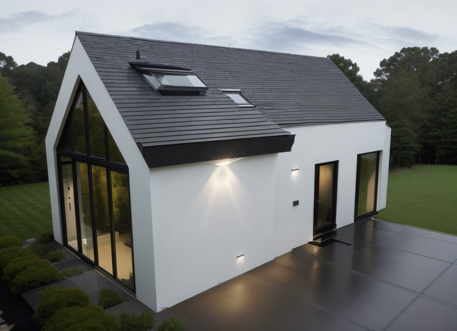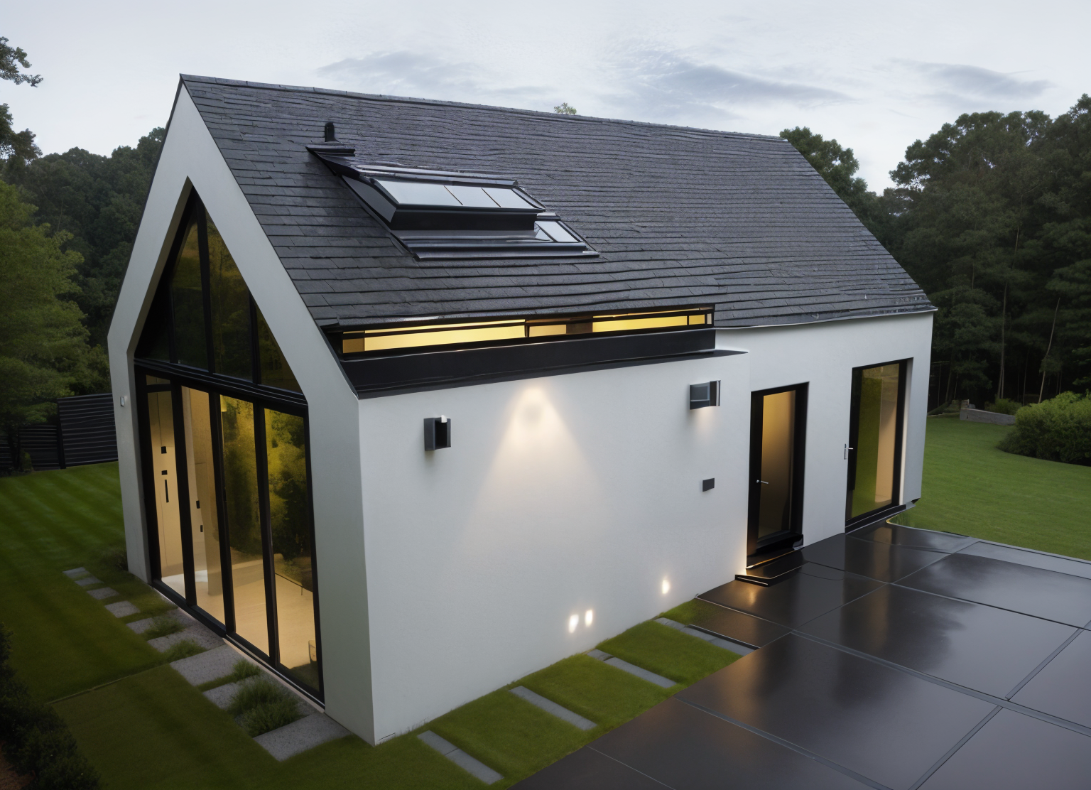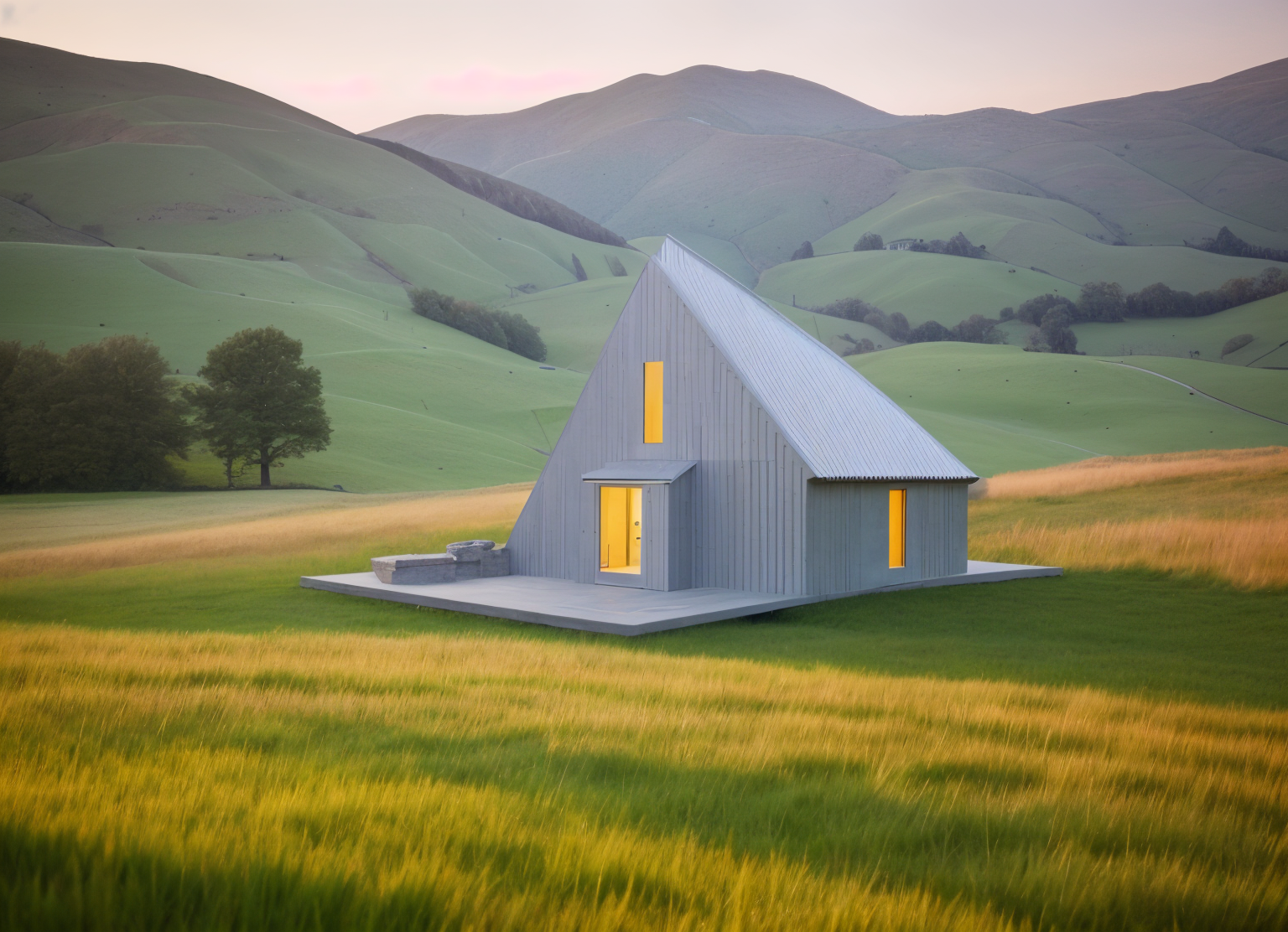 cottage with roof made of corrugated sheet metal and wooden facade on meadow in valley with hills in background architecture
