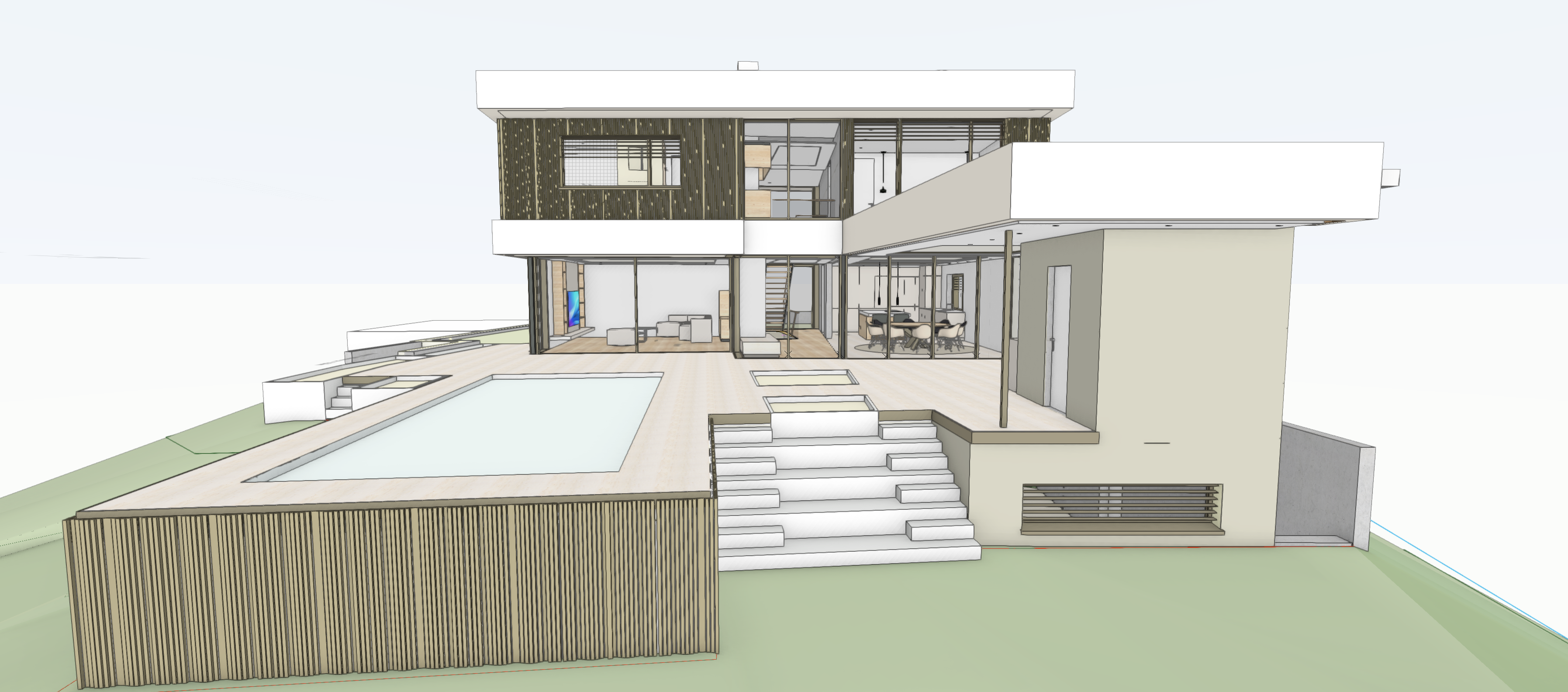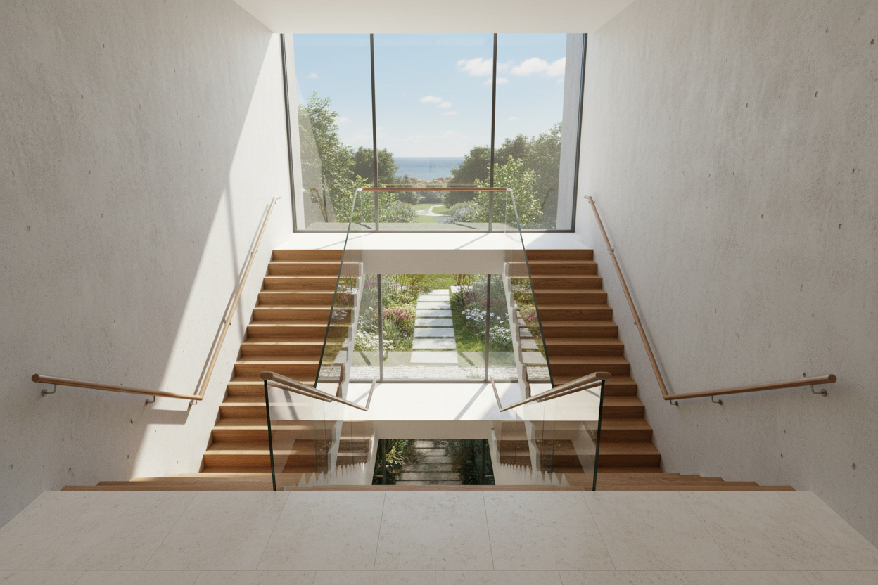 modern dining and kitchen area minimalist design with a warm atmosphere light natural kanfanar stone floor on the left and light oak floor on the right contrasted by dark fireplace in the middle also surrounded by the light natural kanfanar walls in a soft cream color with large glass windows framed in dark bronze ceiling features recessed lighting in a subtle white tone dining chairs are a mix of beige and black with sleek metal legs arranged around a round light oak table on a beige textured rug inviting and elegant ambiance with natural light streaming in enhancing the earth toned palette