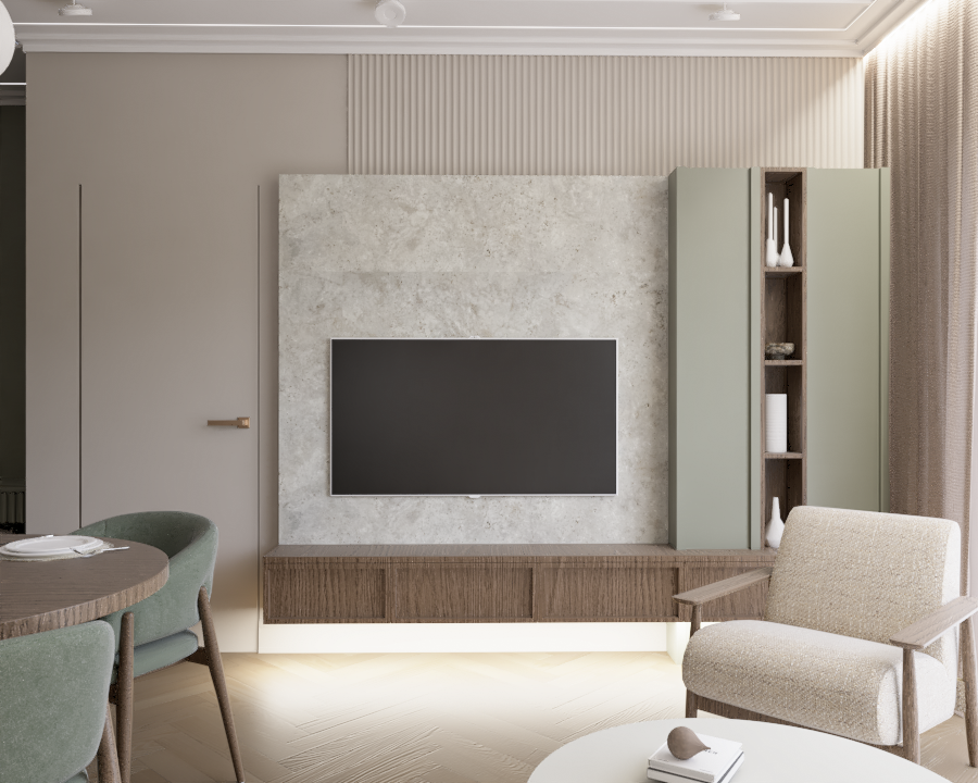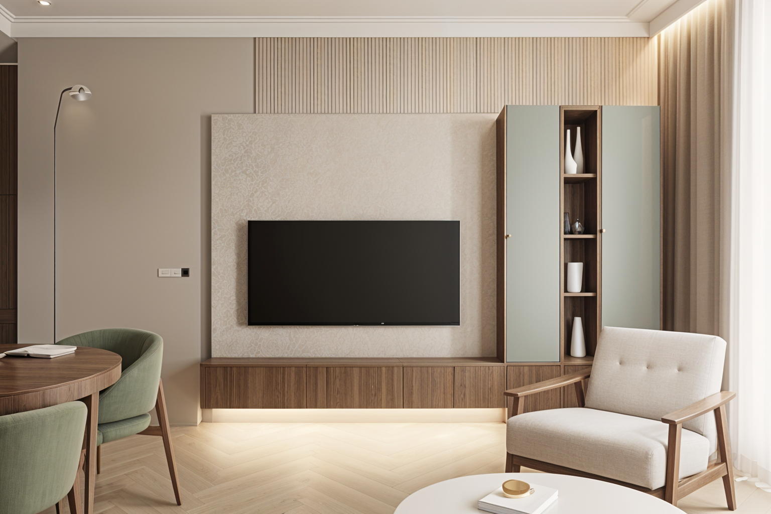 create a cozy and elegant modern interior design a warm atmosphere with soft natural lighting use a neutral color palette with light beige walls and a subtle gray backsplash incorporate dark wood cabinetry and shelving adding sophistication and depth place a round wooden dining table in the center surrounded by plush seafoam green chairs include white pendant lights above the table for a touch of elegance add a beige sofa with a soft throw blanket enhancing comfort ensure the room feels inviting and well organized with clear attention to detail and texture