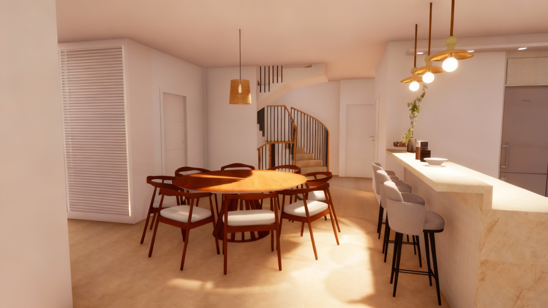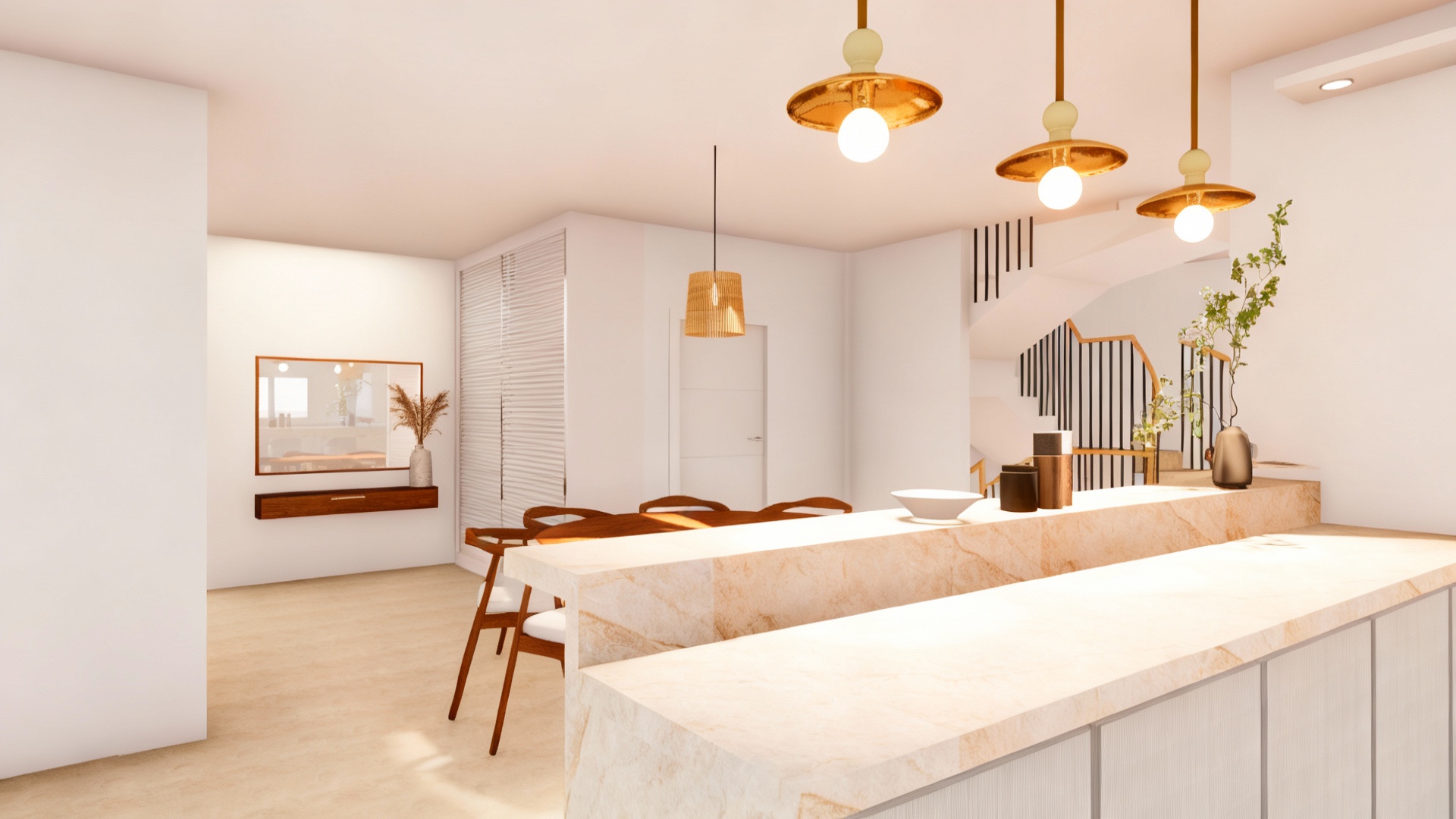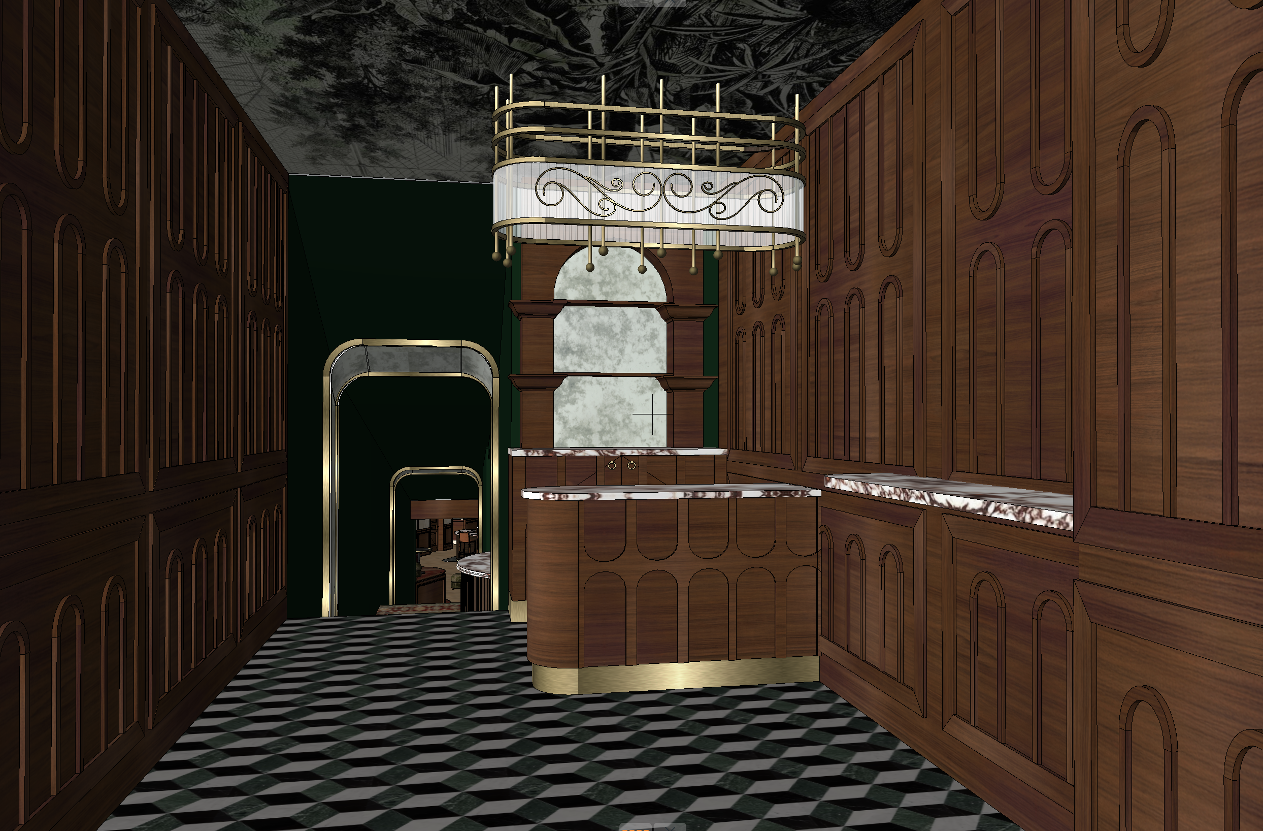 ultra realistic render of the roomservice restaurant host stand area keeping the exact camera angle and geometry aged oak millwork with deep grain brass plinths viola calacatta marble countertop dark bottle green walls and patterned black white green tile flooring arched portals made of antique mirror with soft realistic reflections of the corridor and lights ceiling with dark botanical mural add subtle real world details on the counter a small vase with fresh flowers a leather notebook a brass pen holder and a discreet reservation tray elegant and minimal light d cor on the shelves a small sculpture or vintage object use warm intimate lighting integrated led in the arches soft glow from brass accents gentle fill light to enhance wood and marble textures scene should feel alive premium and welcoming at the restaurant entrance