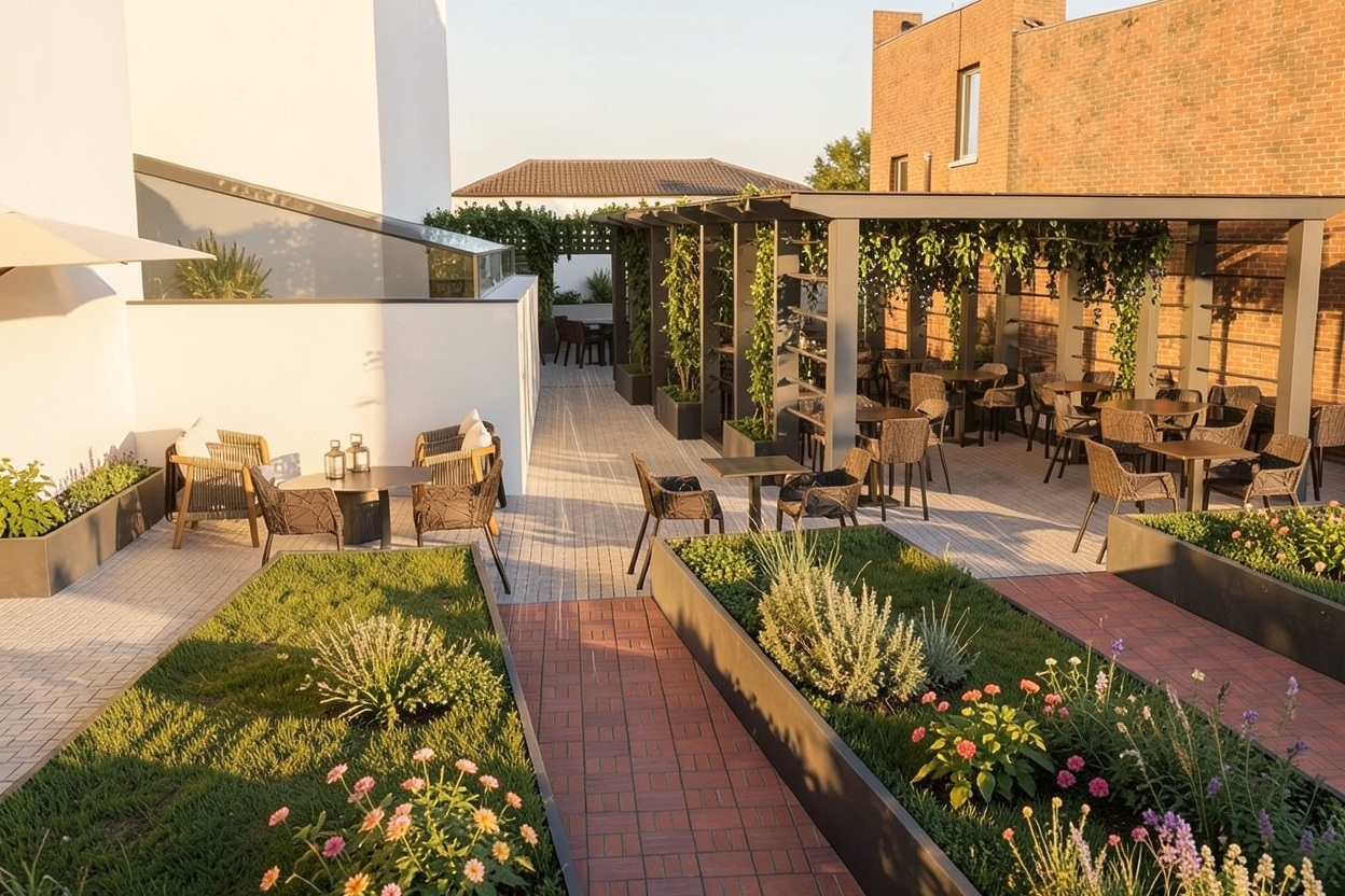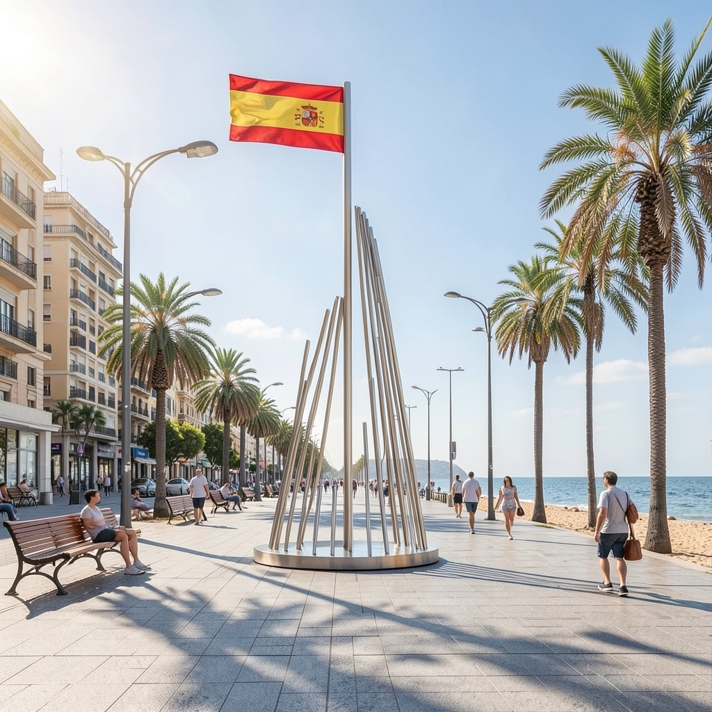 exact replication of the reference monument 19 circular metal profiles maximum height 12 meters do not change the design exact geometry from reference image urban promenade inside the city with wide pedestrian paths benches streetlights and abundant vegetation the monument is not the main subject it appears as a secondary element within the scene partially integrated into the environment other urban elements people vegetation promenade space have more visual prominence vegetation behind the monument dense greenery palm trees and urban landscaping located behind and around the structure creating a natural backdrop spatial composition foreground and midground are fully urban beach and sea only visible in the far background subtle and distant no sand in foreground camera composition eye level view from the promenade wider framing monument not centered slightly off to the side photorealistic architectural render normal summer day natural light everyday activity