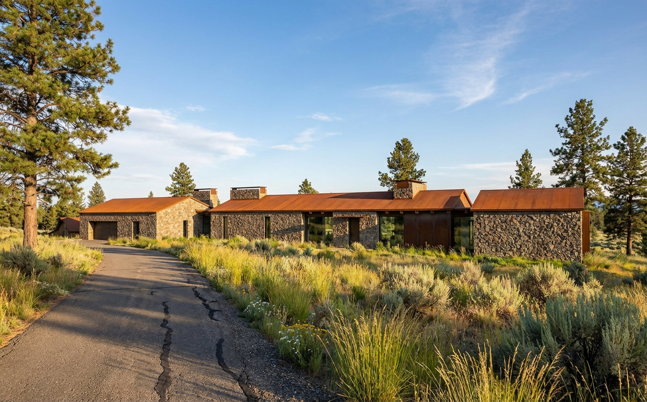 add a low mountain landscape and pine trees flagstone path rustic post lights along path