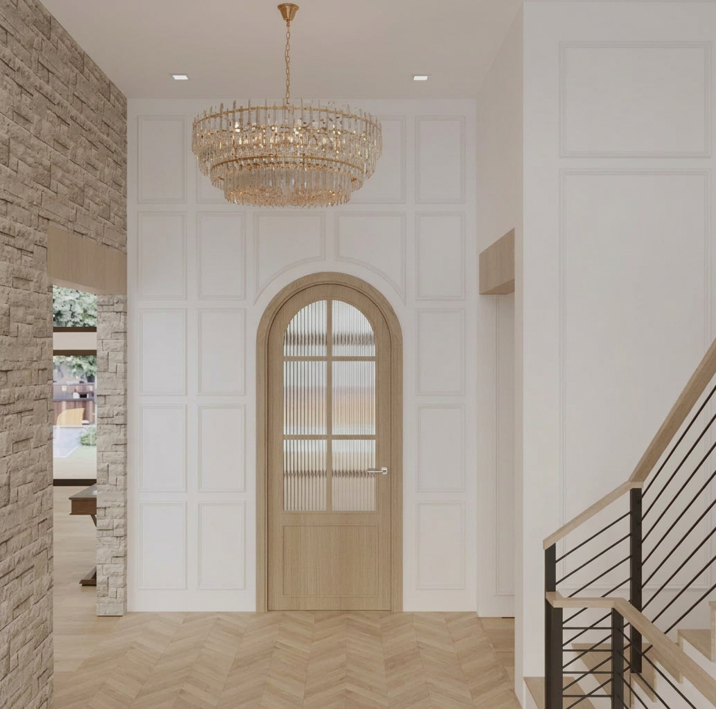 zaha hadid interior shot please keep the door the same center it between the stone wall and the beam make the panelling match the stair paneling move the door to the left architecture