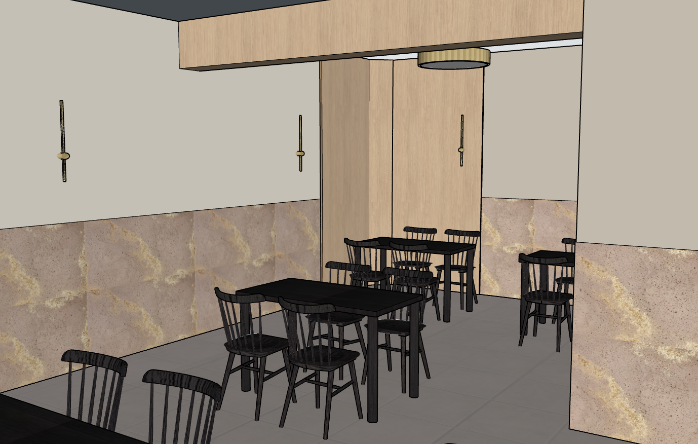 warm colors add light to the lamps tables set with tableware also add some greenery realistic the wall panels have a concrete texture they should not be glossy and there are also wood like panels do not add any additional lighting use only the lighting included in the project add shadows