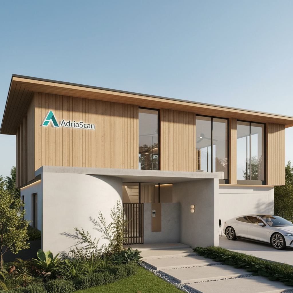 exterior shot make light colour pallete with a modern take add sky with a slightly warm sun and trees in background with grass use cream stonework with darker cladding elements solar panels on roof shown