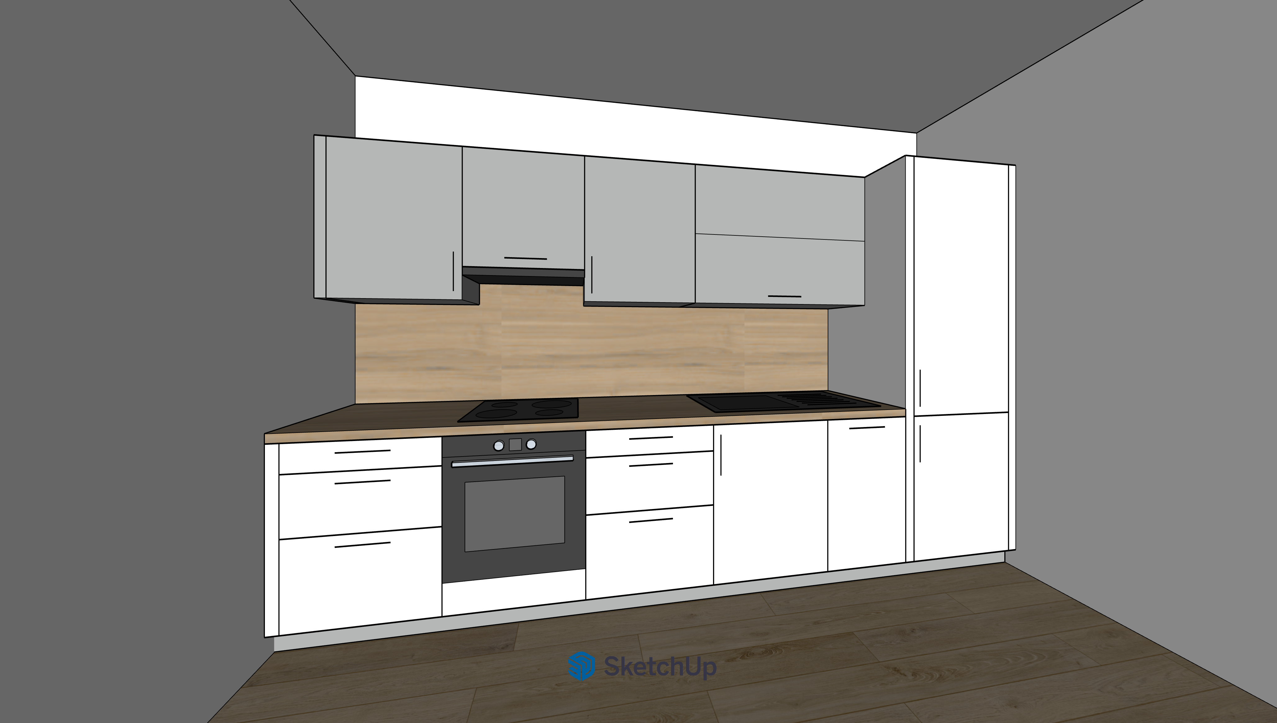 interior shot modern interior design open room and kitchen stylish conference and minimalist furniture light oak with a slight emphasis on the floor slats large glass doors with subtle reflections white walls and ceiling warm ambient lighting soft shadows books on a wooden shelf realistic texture kitchen with white glossy doors on both sides of tall cabinets with a 5 cm wide strip tiling element next to the stove on both sides 3 drawers shallow at the top deep at the bottom the upper cabinets are gray on the left next to the tall cabinet for the refrigerator far right there is a 45 cm wide dishwasher and an upper wide cabinet with a hinged door above the stove there is a cabinet with a strip hood the wall between the upper and lower cabinets is lined with a wooden board in an oak pattern the worktop in the same pattern