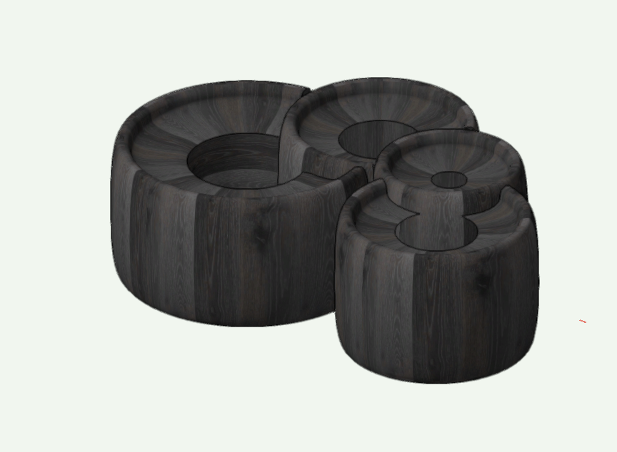 render a set of interlocking dark wooden circular objects with a smooth polished texture the wood is a rich ebony color with visible grain patterns place them on a soft pale green background for contrast the atmosphere is tranquil and modern with soft diffused lighting to enhance the subtle sheen of the wood