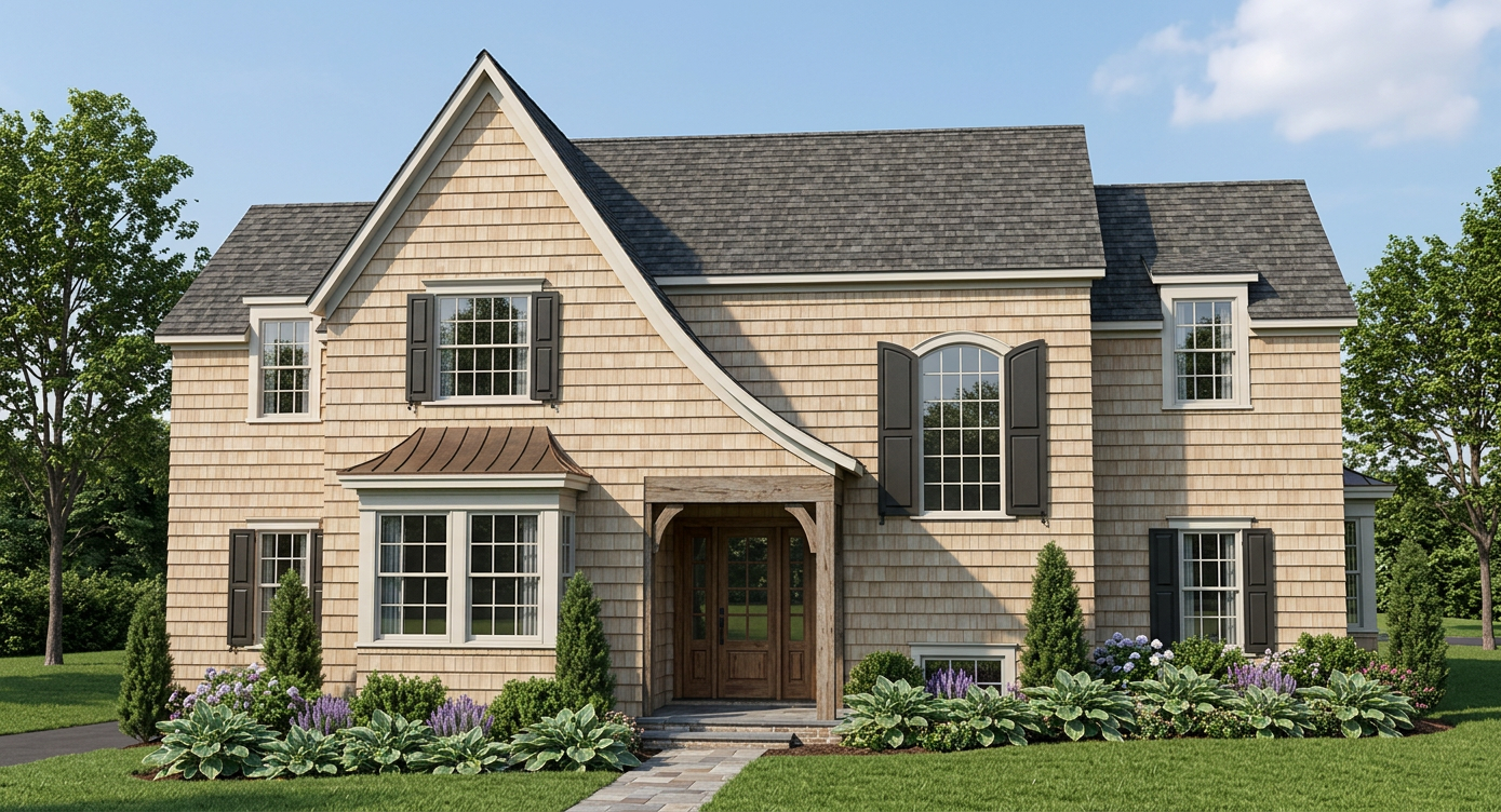 shingle siding with full bright landscaping