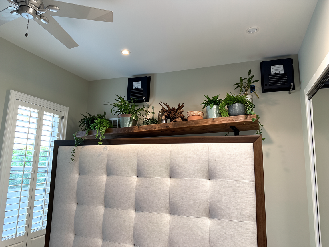 add a paneled wall with a shelf at the top with plants and accessories to hide the black boxes