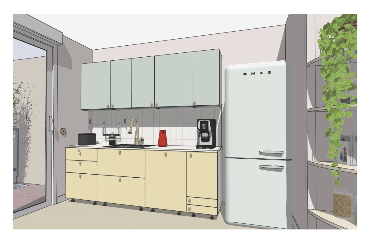 interior shot pastel colored kitchen in a modern apartment soft morning light coming through the french door creative and calming atmosphere white tile backsplash with pink grout gold brass faucets and handles creamy white quartz countertop birch wood shelves architecture