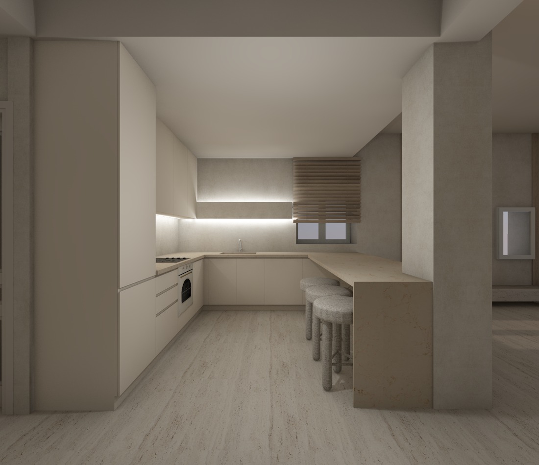 create a highly realistic render of a modern kitchen in a coastal home with a calm warm and refined atmosphere the design is minimal and cohesive inspired by seaside living with a soft neutral palette that evokes natural light sand tones and a relaxed elegance the kitchen layout is linear with an l shaped extension featuring clean handle less cabinetry in a light beige tone with a matte finish the surfaces appear smooth and seamless the countertop and backsplash are in a natural light beige stone reminiscent of sand and coastal textures with subtle variations and a soft matte finish a hidden led strip is installed beneath the upper cabinets providing soft indirect lighting that gently illuminates the backsplash and enhances the warm ambient atmosphere in the foreground there is an extended kitchen island or bar with a monolithic appearance in the same light beige stone material in front of the island there are bar stools with light oak wooden legs and a natural finish the seats are upholstered in a soft light beige linen fabric adding a breathable coastal character at the back a window allows soft natural light to enter the space filtered through a light fabric roman shade in a neutral tone reinforcing the relaxed seaside feeling the walls are finished in light beige microcement and the flooring is in a light natural tone enhancing the airy and serene coastal atmosphere the overall lighting is soft and diffused combining natural light with hidden led lighting creating minimal shadows and a warm inviting high end coastal ambiance ultra realistic render high resolution premium materials coastal interior design interior design magazine photography style the backplash of the kitchen is cemento effect like the walls