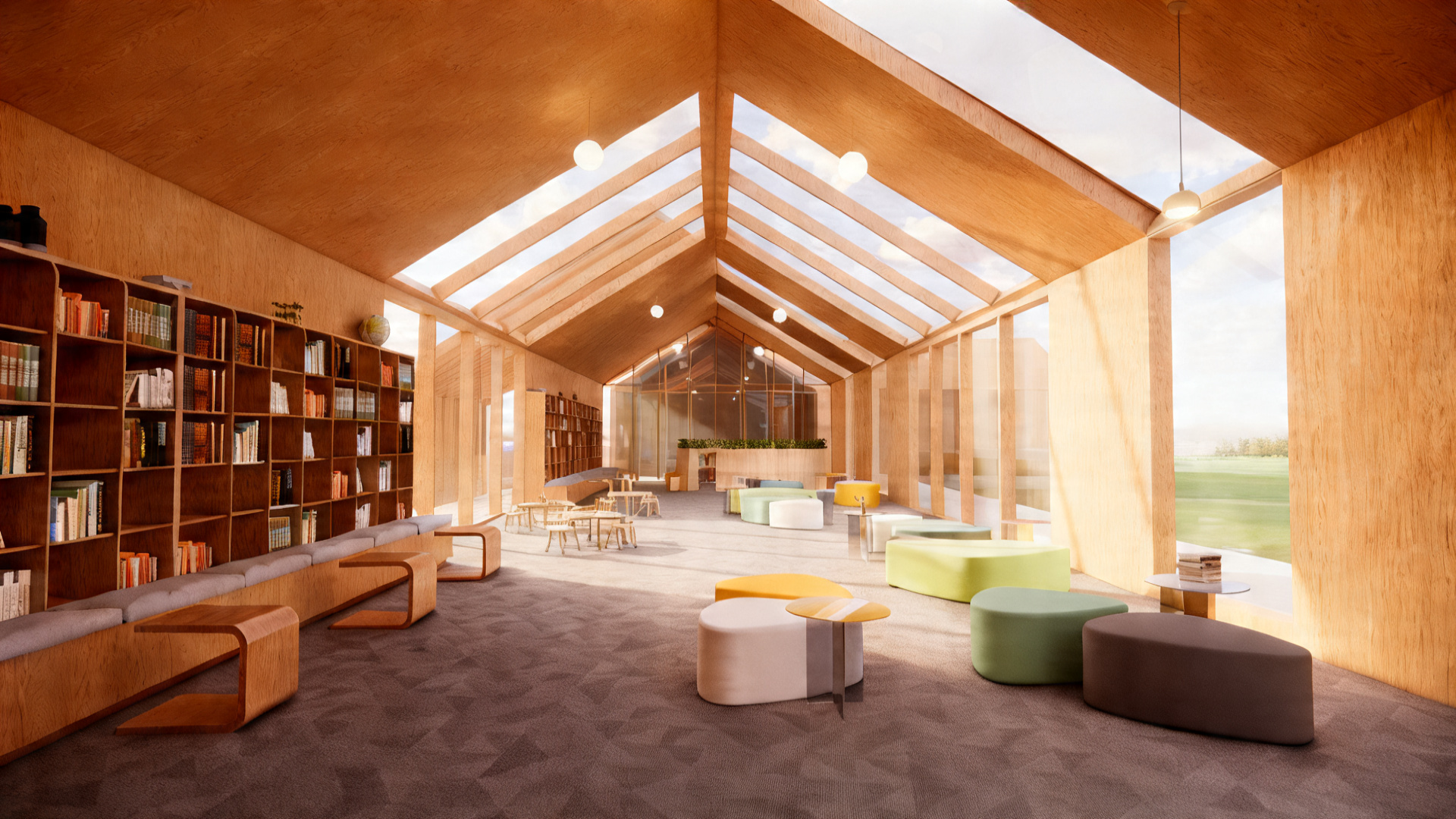 refine this architectural interior by improving clarity contrast and tonal balance while strictly preserving all geometry materials and lighting reduce remaining haze and soften overexposed highlights especially near skylights and sunlit walls slightly increase contrast to restore depth and material definition without darkening the image maintain bright natural daylight with balanced exposure ensure cross laminated timber retains warm natural tones with clear grain and no oversaturation keep pendant lights softly glowing with realistic falloff and no overexposure enhance sharpness and edge definition while preserving a clean high end architectural photography look