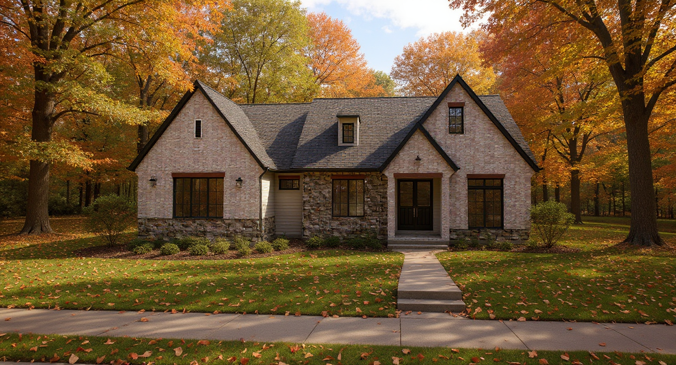 autumn day with leaves blowing landscaping at front sidewalk going to front door potted plant on front porch