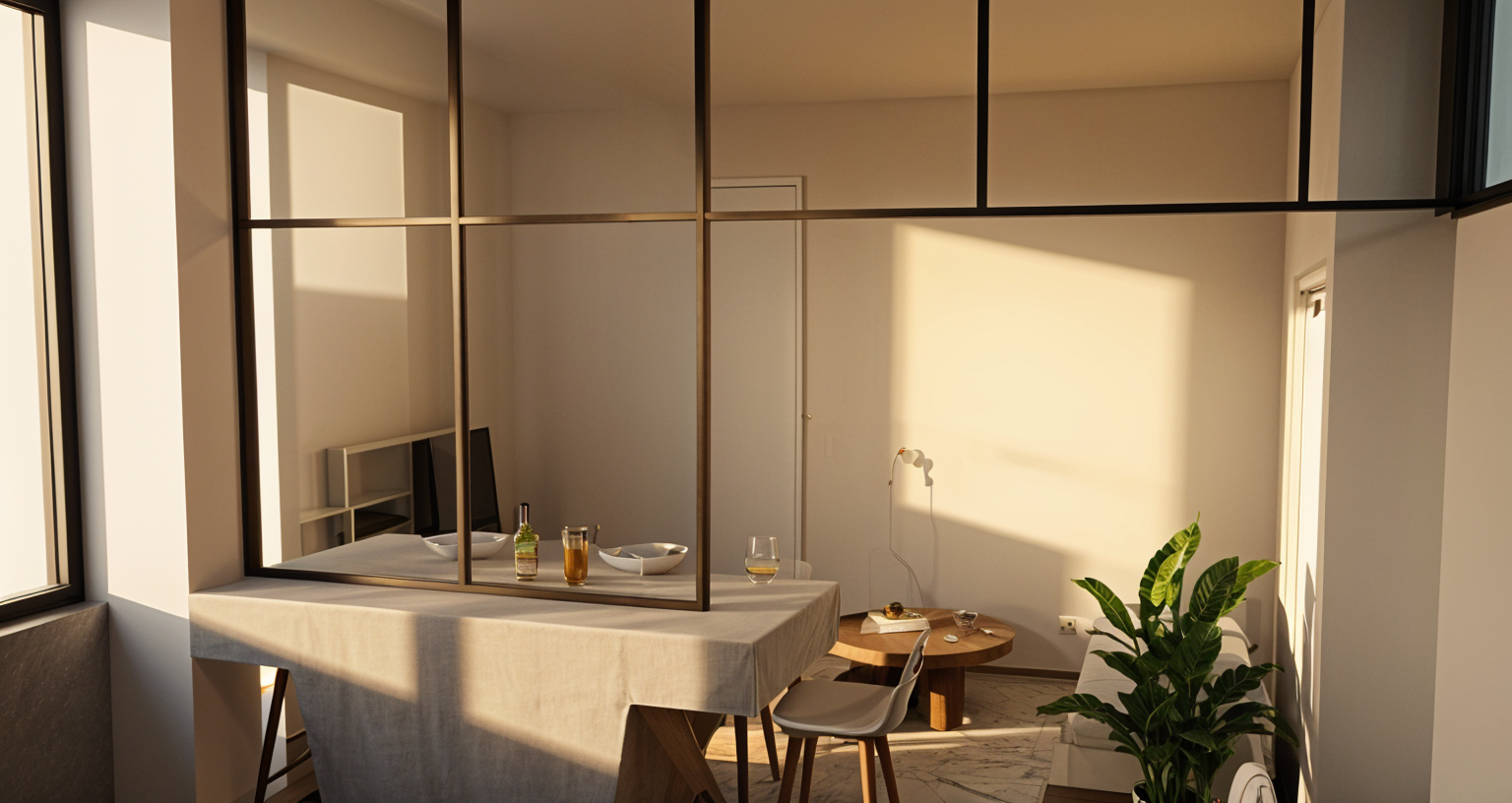 la pi ce se situe au 1er tage et la vue est compos e de v g tation et d immeubles bas les suspensions sont allum es le couloir est clair par les dalles led pr sentes les profil s des cloisons amovibles sont blancs la table ronde dans le coin de la salle d attente est blanche les cloisons pleines sont gris tr s clair mat pas de spots suppl mentaires rajouter un montant vertical la fen tre noire de gauche avant la cloison enlever le poteau noir cot de la chaise allumer les suspensions de la salle d attente mettre le m me plafond bois dans le d croch de plafond gauche