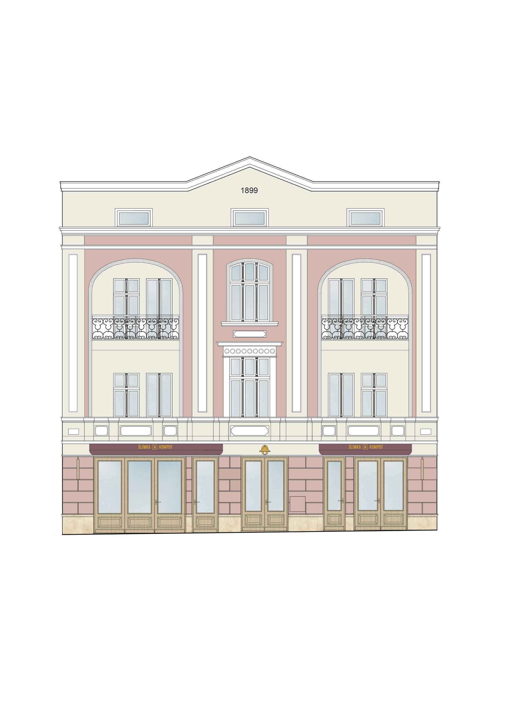 the lower plinth is made of sandstone the ground floor fa ade is finished with rusticated plaster painted in the color shown in my sketch the shopfronts on the ground floor are in natural oak the awnings above the shopfronts only on the ground floor are in a plum color above ground floor there is no awnings with gold lettering as shown in my sketch the balconies are recessed they are loggias the building is straight on the pavement