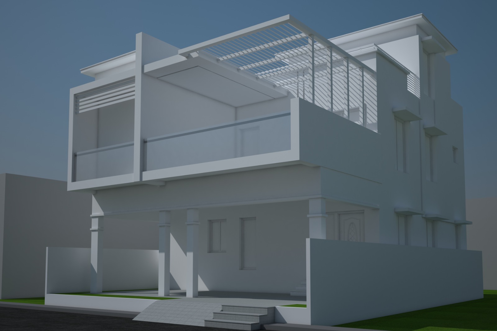create a contomporary style elevation realistic render add planters people on balcony and car on the car parking space black stainless steel pergola and taupe texture paint
