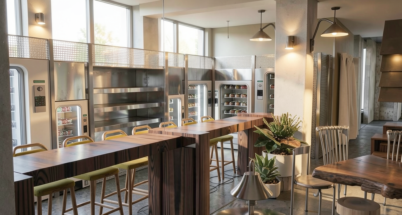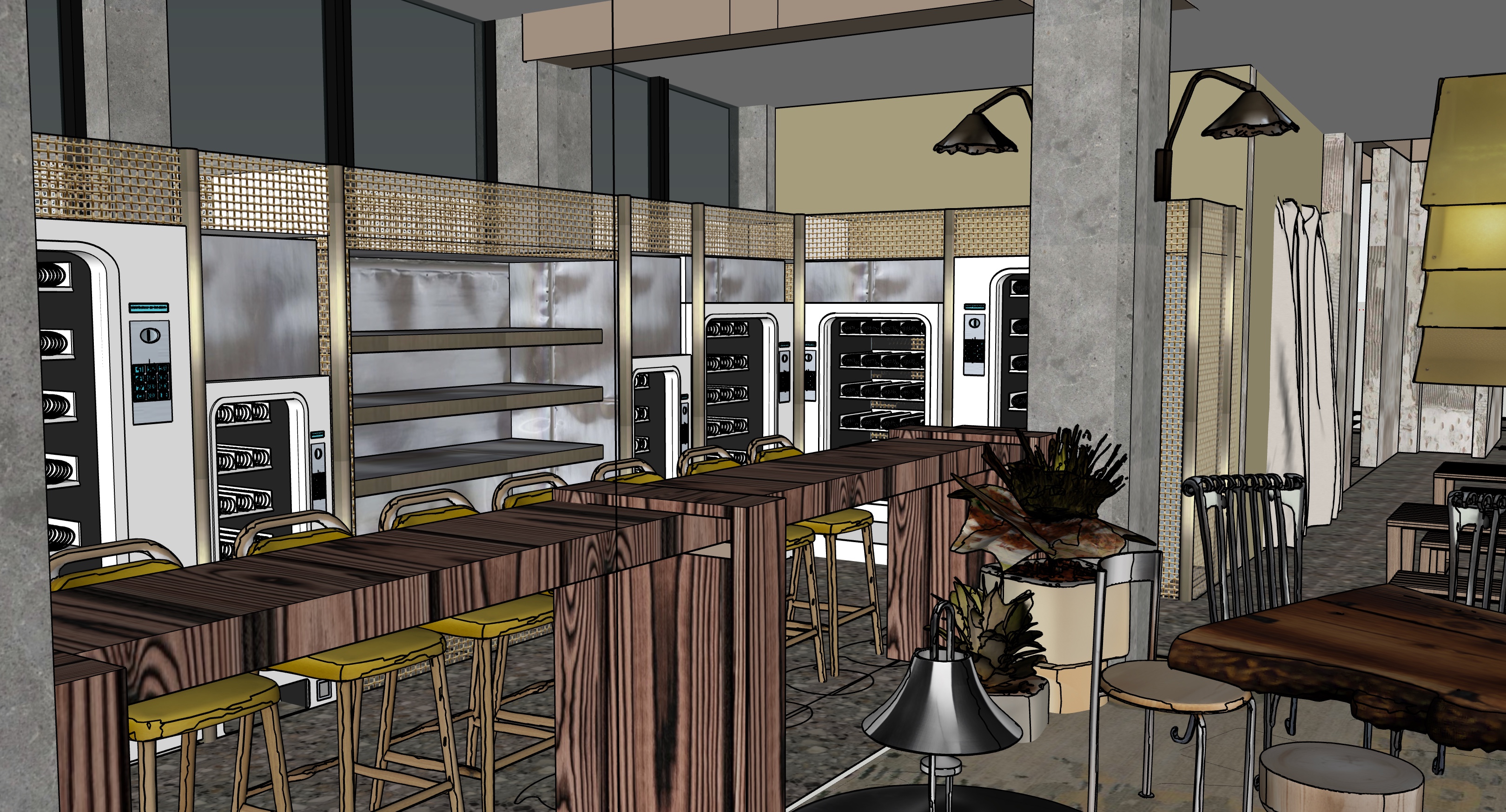 make photorealistic add lights to wall lights and pendants add light through window make metals look slightly reflective remove lights from columns behind vending machine stainless steel panels above vending machine to be recycled make circular brass rods to in between vending machines to be smaller diameter don t add any new lights all finishes to be quite textural warm ambience pendant light to behind column should be wall light