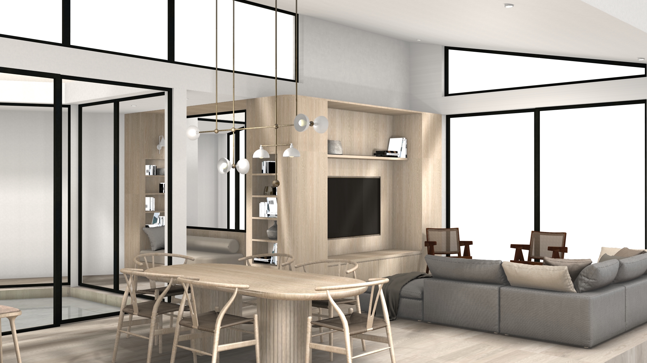 nordic interior shot add 2 large green trees and garden landscape background architecture