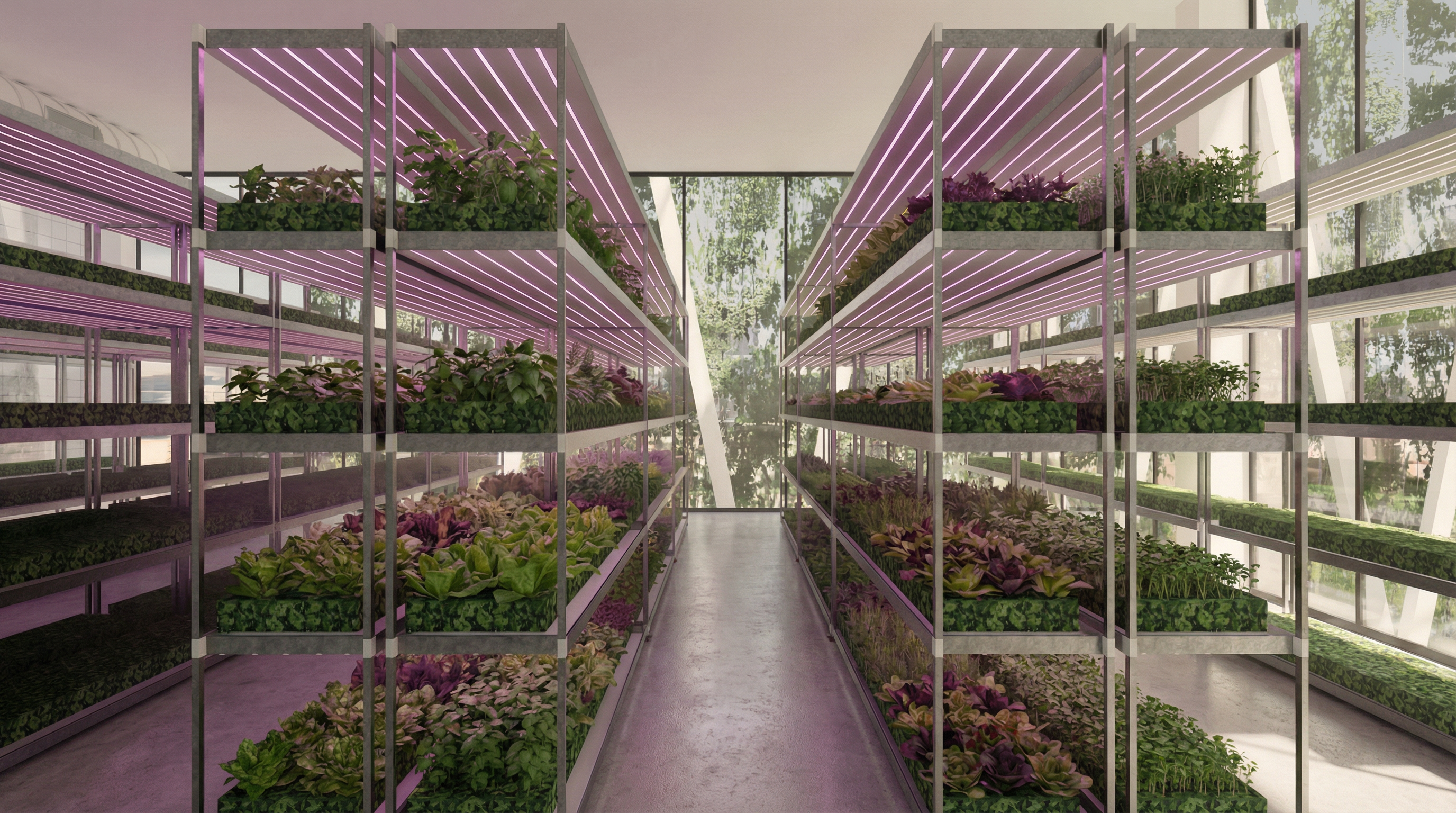 add the same soft purple led light spill and underside illumination to the outer right tray levels so they visually match the lighting intensity glow and gradient seen across the inner trays and the outer left side ensure the added led lighting remains subtle clean and integrated into the existing grow light rhythm without altering geometry crops or camera framing