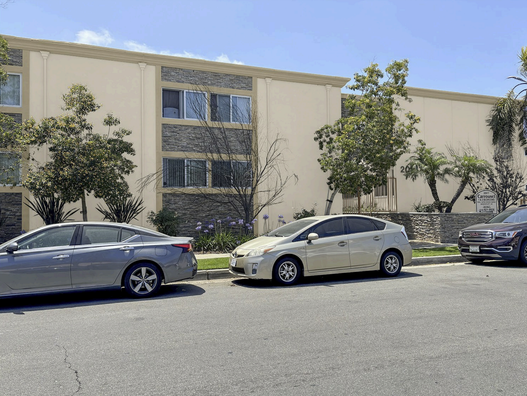 make all the trims and doors a dark grey brighten the white walls make the trim around the windows and the trim along the top of the building a dark grey keep the stone and everything else exactly the same