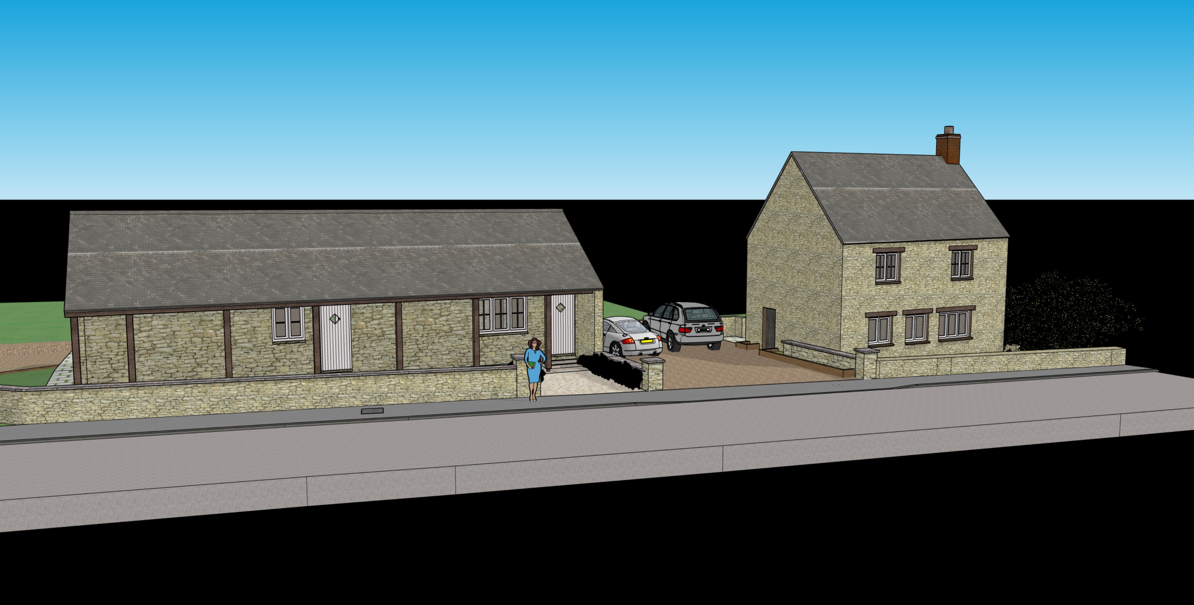 render a photorealistic 3d perspective of this house in oxfordshire uk reference the current material style keep model geometry the same windows doors roof walls garage door pavement driveway do not change the view or colour scheme only enhance the current materials such as stone and clay roof tiles and make the landscape native to the uk and glass reflections and a vibrant clear sky with light atmospheric depth render in hyper realistic architectural visualization quality 8k resolution
