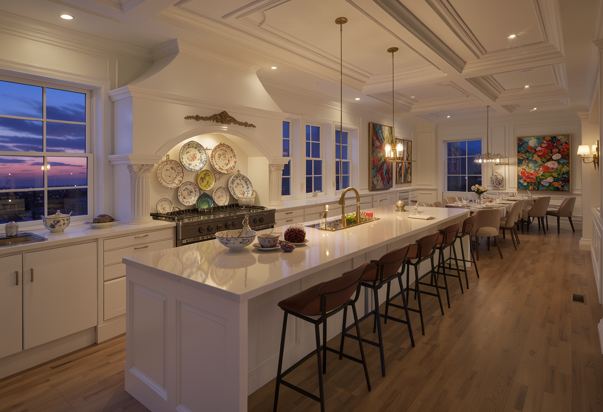 elegant realistic image with white painted paneled walls and columns add interior lighting dusk sky outside add decorative dishes add colorful art on rear wall soften the sky luxurious accessories add ceiling coffer remove window on back wall remove plates under range hood