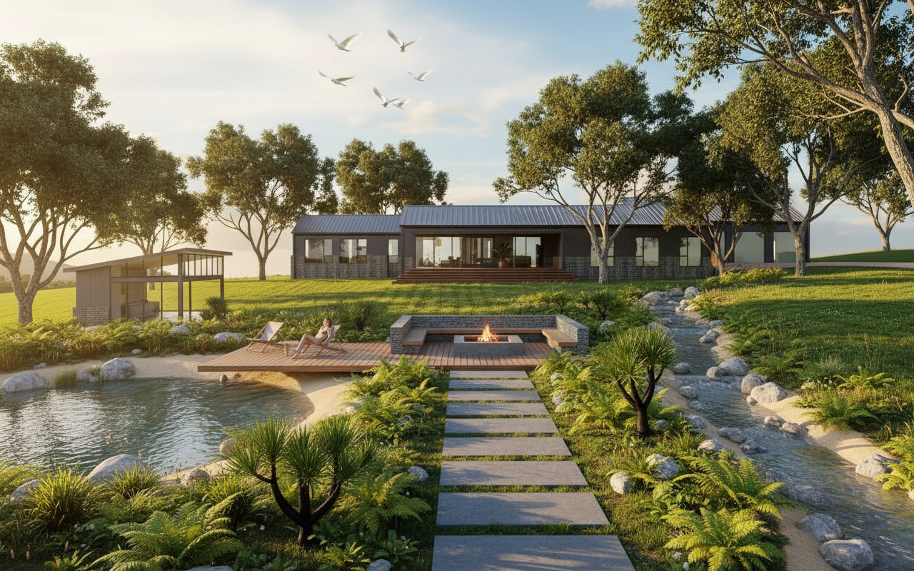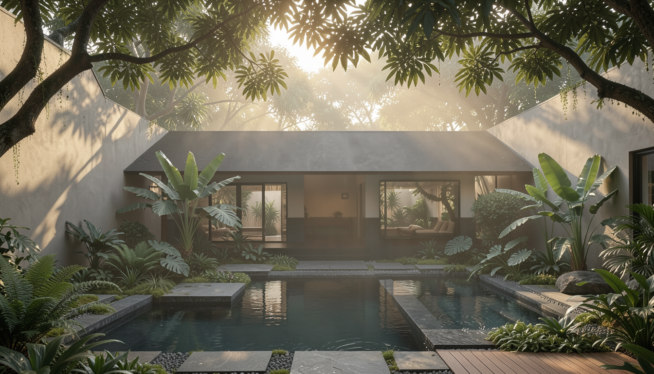 maintain the building shape and detail maintain swimming pool size and position contemporary tropical courtyard in early morning with visible dew on leaves soft golden sunrise filtering through dense canopy light humid haze creating depth architecture minimalist rectilinear pavilion with smooth warm gray plaster walls dark basalt stone base deep overhangs slim black steel frames large glass openings reflecting greenery calm grounded geometry landscape layered tropical planting such as ferns monstera banana leaves colocasia creeping ground cover moss between large floating stone slabs curated density with controlled negative space stepping pads over swimming pool water elements linear basalt swimming pool water surface calm with gentle ripples ground treatment oversized stone slabs fine gravel joints soft moss transitions teak decking accents atmosphere intimate immersive serene dew catching light on leaf edges soft shadow patterns across plaster walls slight mist diffusion for cinematic depth color palette deep tropical greens charcoal stone muted earth tones warm gray plaster camera style architectural photography eye level perspective shallow depth of field ultra realistic texture detail natural color grading mood keywords serene tropical sanctuary modern courtyard retreat morning ritual atmosphere water and foliage harmony contemplative garden space