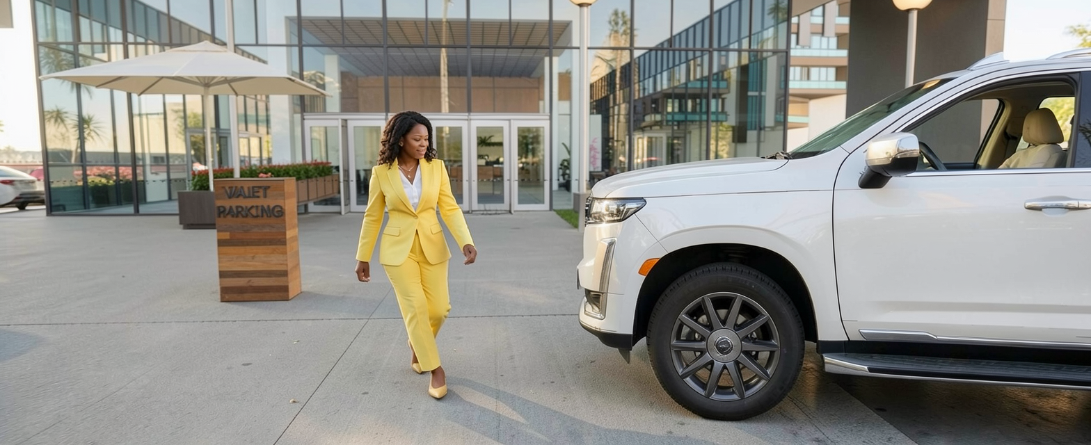 pretty black woman in yellow suit professional walking out and getting in car and driving off