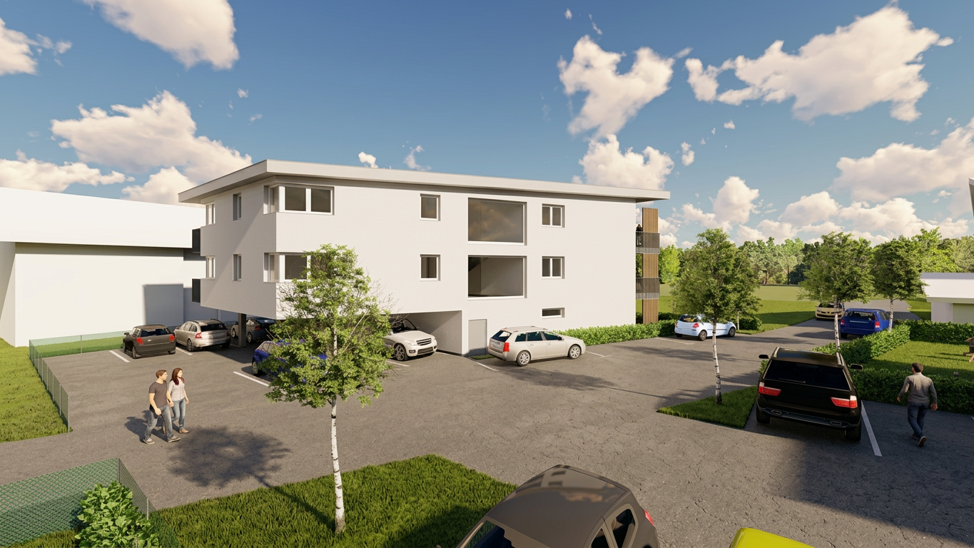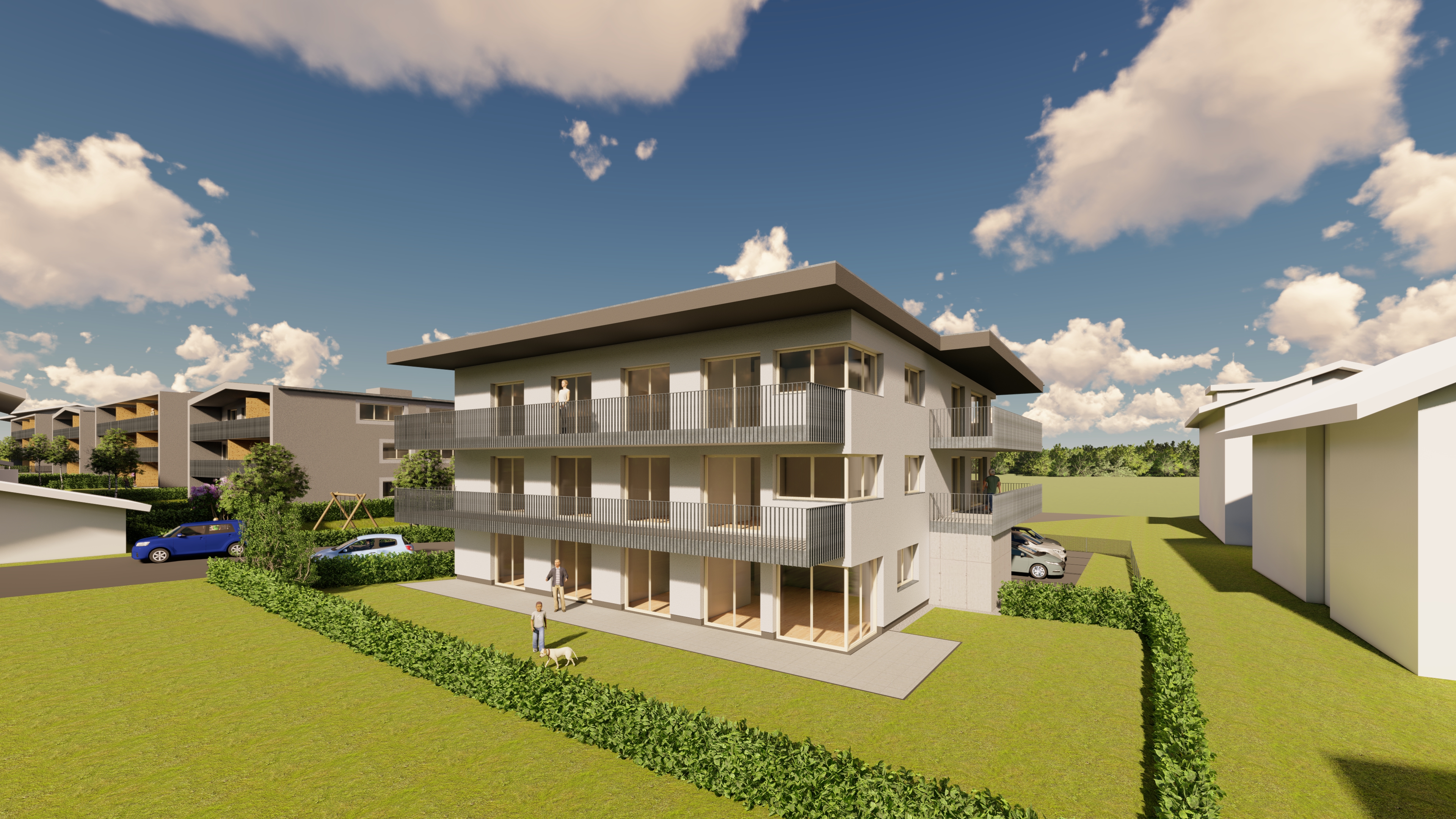 render the scene on a beautiful spring day the materials and colors must be maintained the facades in smooth plaster the windows as white plastic windows the balcony railings in galvanized dark steel depict the lawn realistically add a few people to the image the entire image in realistic and vibrant light