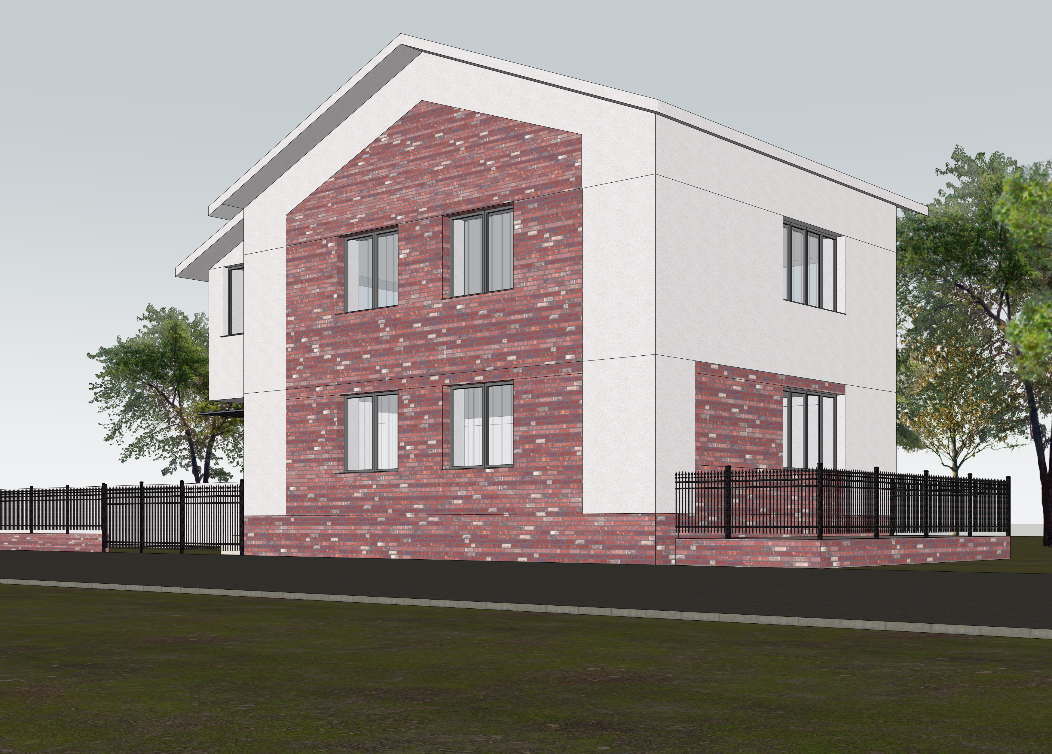 roof terracotta wavy terrace furniture modern cozy greenery around the house nice wather summer around 6pm breeze 2 people wander on the pavement reference photo for the brick
